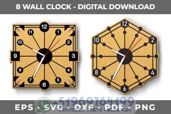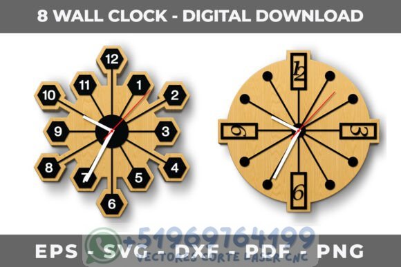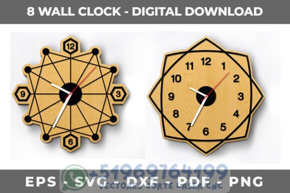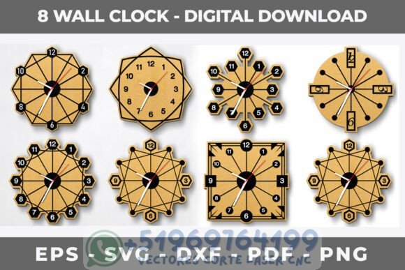 🕰️ Pack de 8 Diseños de Relojes de Pared Modernos – Archivos EPS, SVG, DXF, PDF y PNG 🕰️