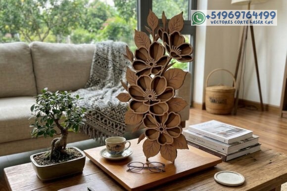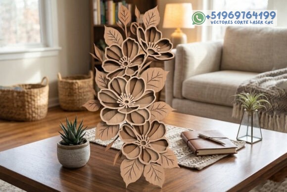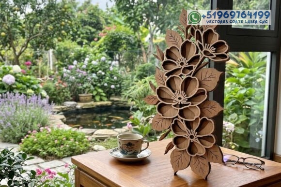 Este adorno floral en capas convierte la madera en una pieza escultórica llena de profundidad, donde cada pétalo parece cobrar vida con la luz y la sombra.