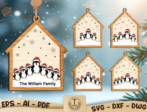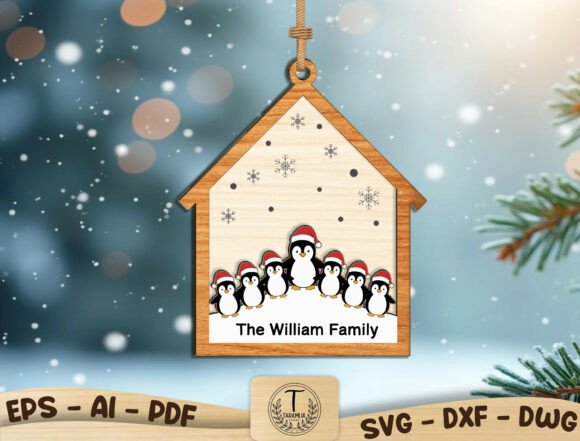 Da vida a esta tierna escena invernal con un adorno familiar de pingüinos, diseñado especialmente para corte láser en MDF o madera de 3 mm. Es un archivo digital perfecto para personalizar con el nombre de la familia y crear un detalle navideño único, cálido y memorable.