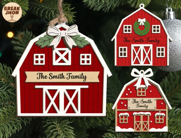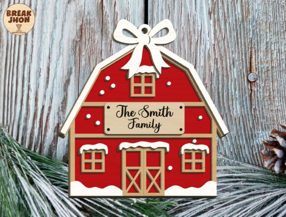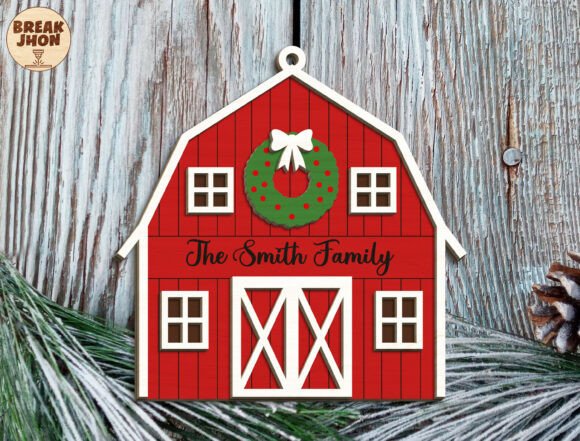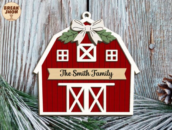 Este diseño es una pequeña joya festiva: un granero rojo navideño completamente personalizable con el apellido o nombre de tu familia. Ideal para colgar en el árbol, decorar una pared, usar como detalle en empaques premium o incluirlo en tus productos artesanales.