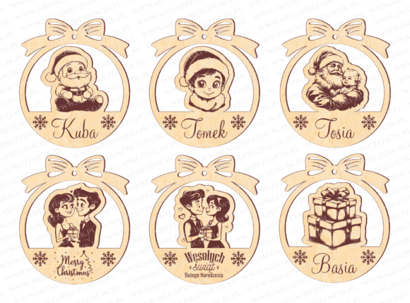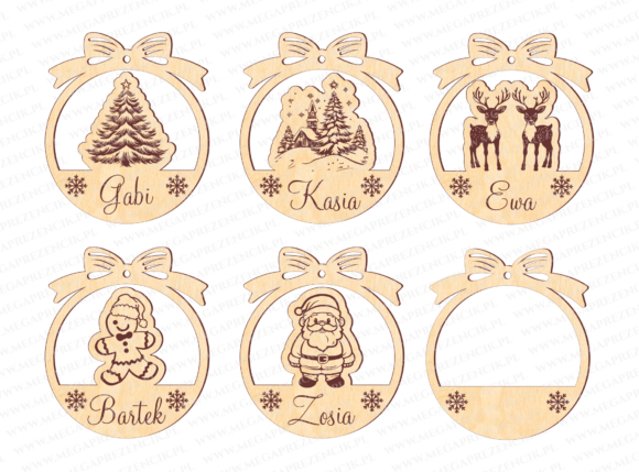 Su diseño circular con lazo superior les da un acabado elegante y tradicional, ideal para resaltar en cualquier decoración navideña. Listos para cortar en MDF, triplay o acrílico.