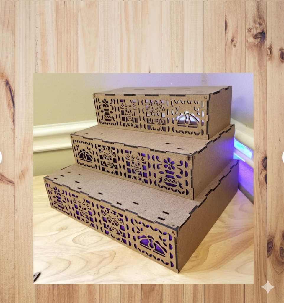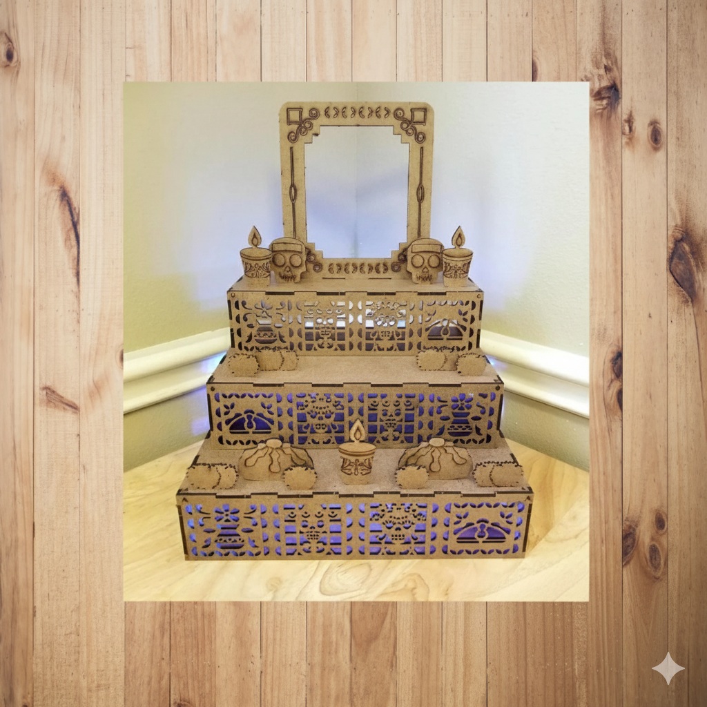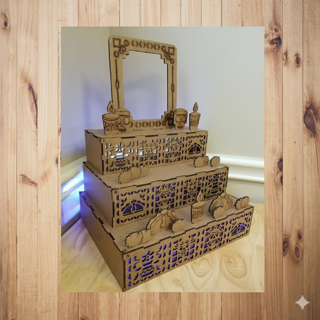 Celebra el Día de los Muertos con un diseño único y detallado: altar de tres niveles para corte láser, ideal para decorar y rendir homenaje de manera especial. Este archivo digital ha sido creado con precisión para resaltar los símbolos tradicionales y aportar un toque artesanal a tu espacio.
