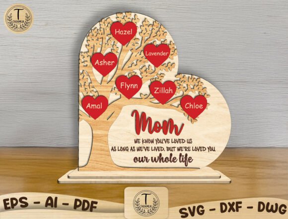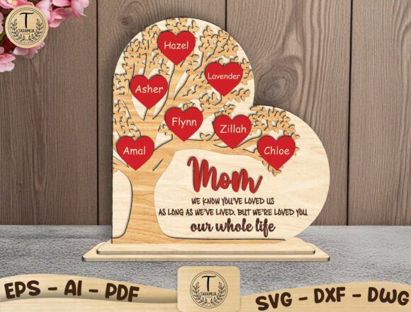 Archivos en SVG, DXF, EPS, PNG y PDF, compatibles con LightBurn, CorelDRAW, Illustrator y máquinas CNC de corte láser. Diseño perfecto para crear decoración familiar personalizada, regalos para mamá, árbol genealógico decorativo y recuerdos artesanales en madera.
