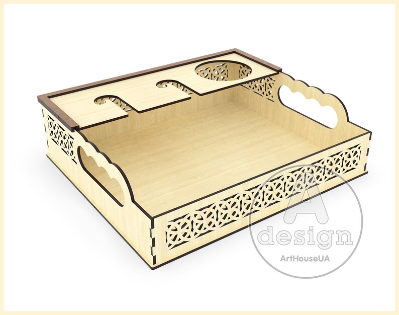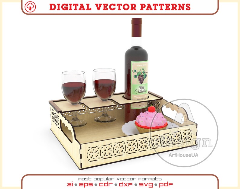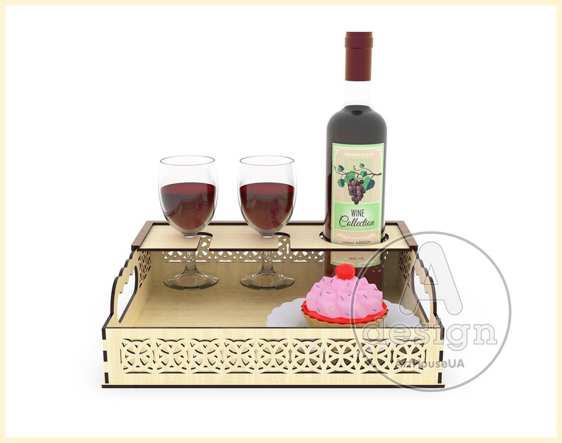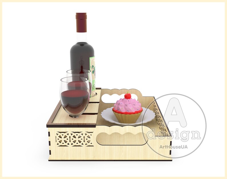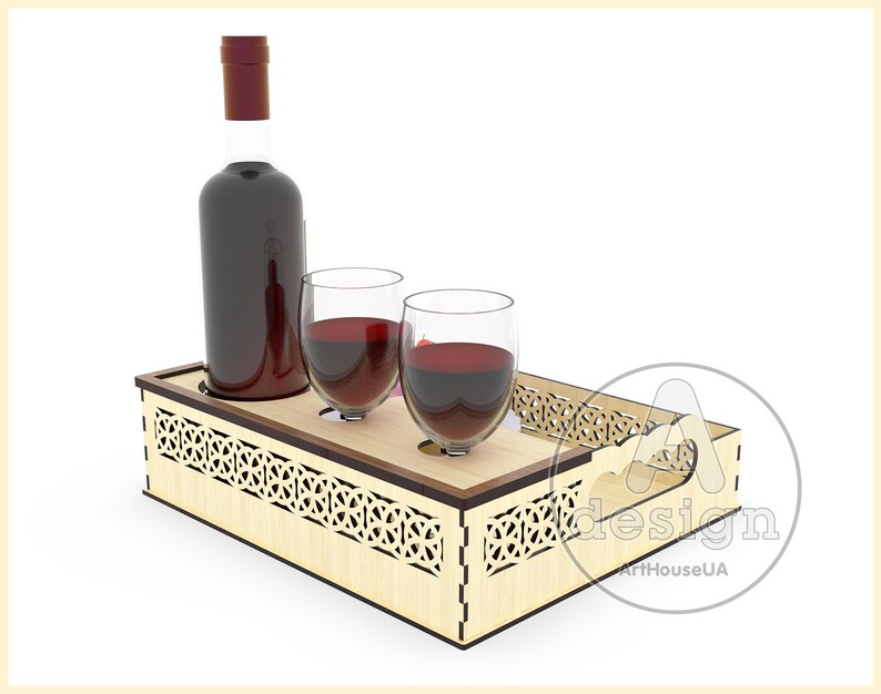 Elegancia, diseño y funcionalidad se combinan en esta bandeja para servir vino con soporte para copas y botellas, perfecta para ocasiones especiales o para añadir un toque sofisticado a tu decoración. Su estructura precisa, diseñada para corte láser, permite organizar y presentar bebidas y postres de forma segura y atractiva.