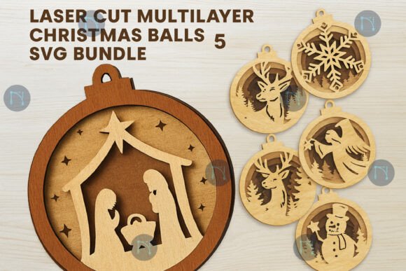 Decora tu árbol y tus espacios con este set de bolas navideñas multicapa para corte láser, un paquete de 5 diseños exclusivos que combinan detalles tradicionales y un efecto 3D encantador. Incluye figuras como el pesebre, renos, copo de nieve, ángel y muñeco de nieve.