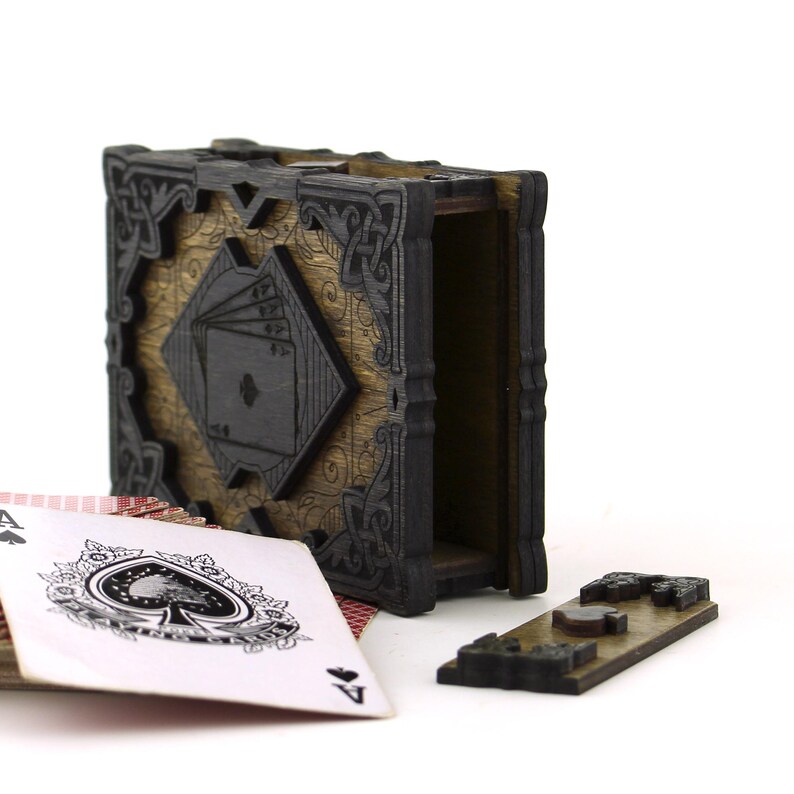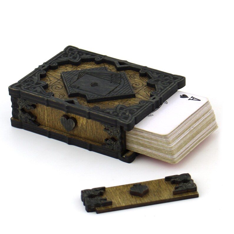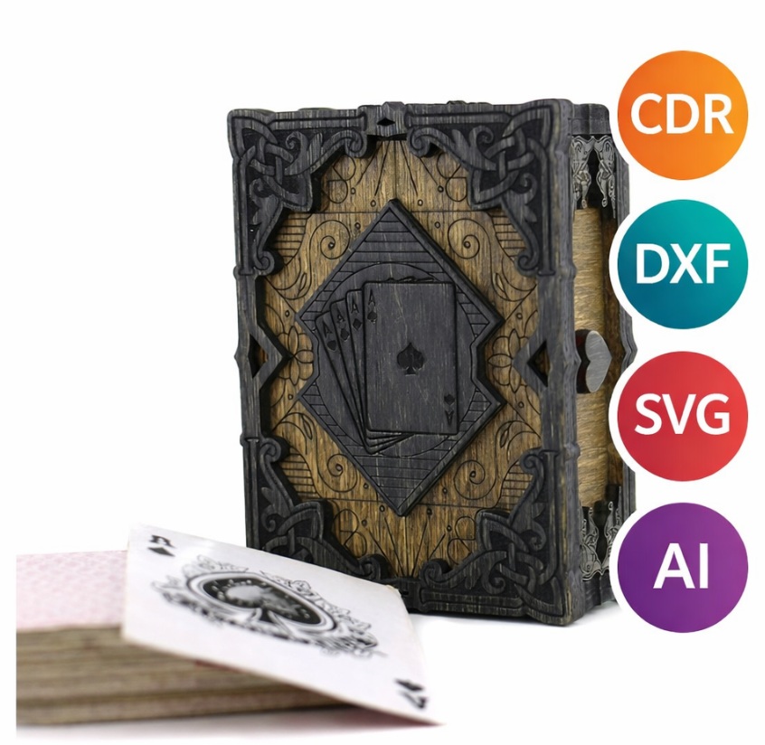Este diseño de caja para baraja de cartas está pensado para quienes buscan un producto con presencia, detalle y carácter. Su estética artesanal, con relieves ornamentales y un estilo clásico–medieval, convierte una simple caja en una pieza decorativa ideal para regalos, coleccionistas o venta premium en madera.