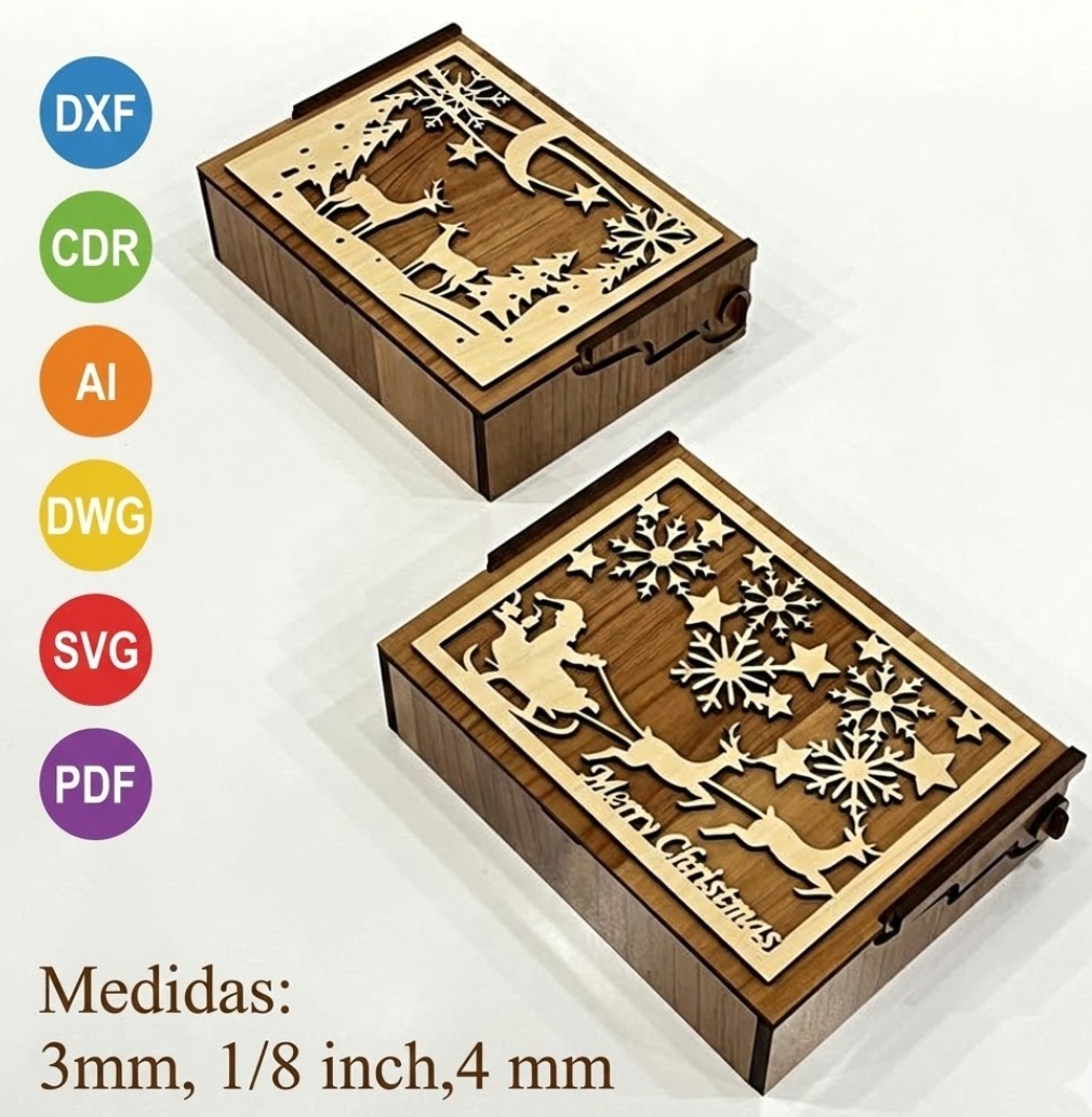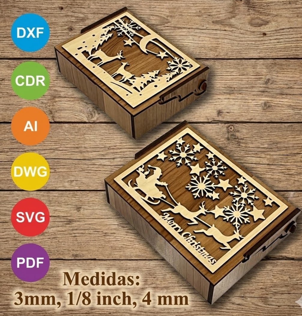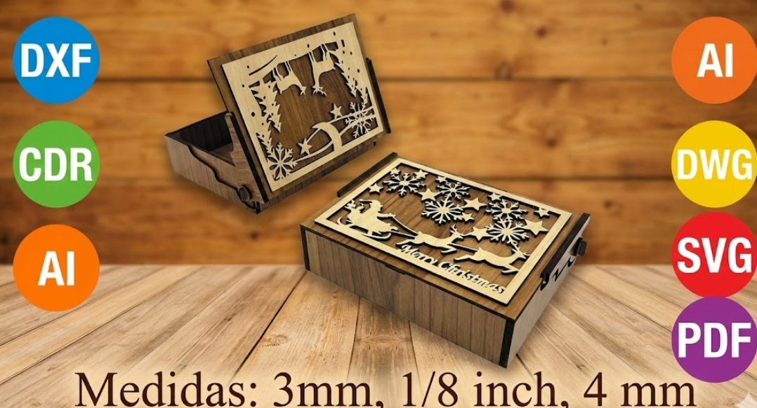 Esta caja navideña de madera con tapa calada combina elegancia, detalle y funcionalidad, pensada para quienes trabajan con corte láser y buscan productos fáciles de vender, personalizables y con alto valor decorativo.
