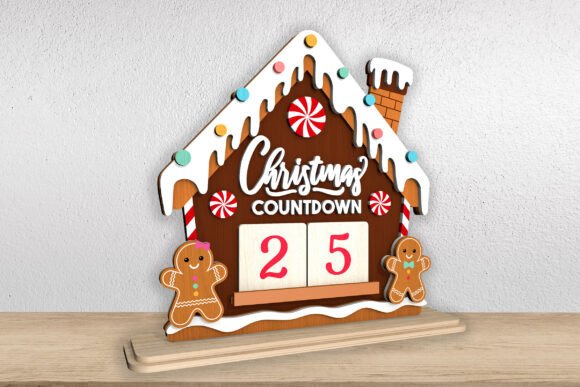El diseño incluye una base estable, fachada tipo casa navideña con detalles de chimenea, cercas, caramelos y personajes de galleta, además de un sistema de números intercambiables que permite marcar cada día hasta llegar a Navidad. Es un proyecto perfecto tanto para decoración del hogar como para venta de productos personalizados.