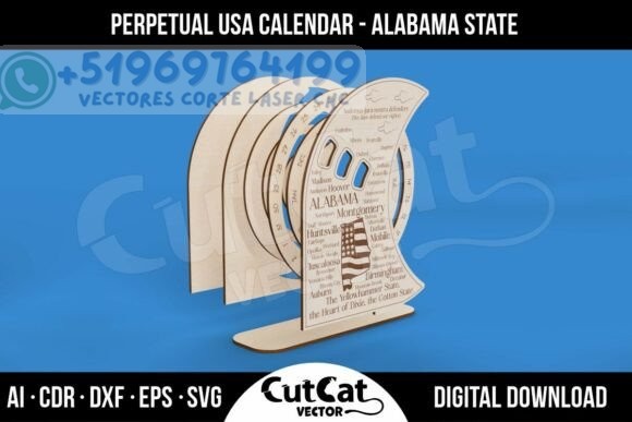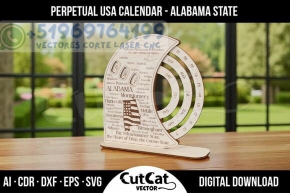 Descubre este elegante Calendario Perpetuo inspirado en el estado de Alabama, ideal para cortar en láser y destacar en cualquier escritorio, oficina o espacio personal. Su diseño curvado y sofisticado incorpora nombres de ciudades, referencias culturales y una composición estética que lo convierte en una pieza funcional y decorativa.