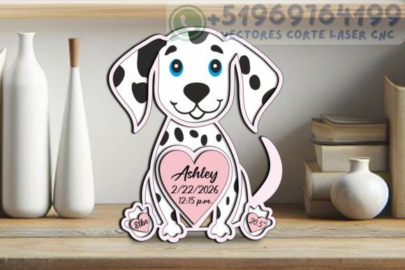Diseñado especialmente para corte láser CNC, este adorable Dálmata te permite grabar los datos más especiales: