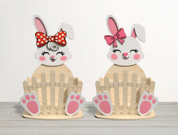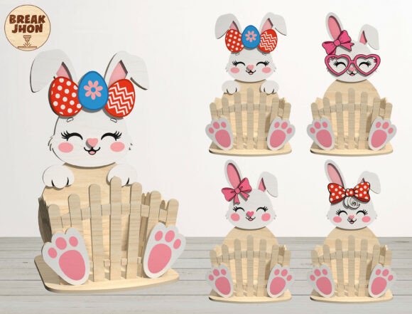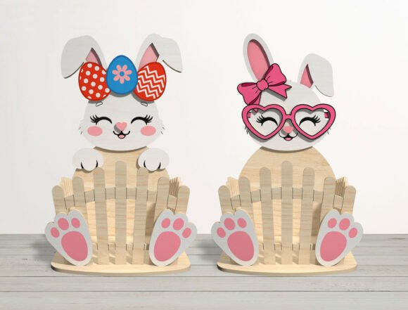 El conejito asoma alegre desde una cesta frontal, con patitas visibles y detalles intercambiables como lazos, flores, gafas y orejas decoradas. Todo construido en capas, logrando volumen real sin complicar el armado. Ideal para regalos, decoración infantil, mesas de Pascua o productos personalizados de alto valor emocional.