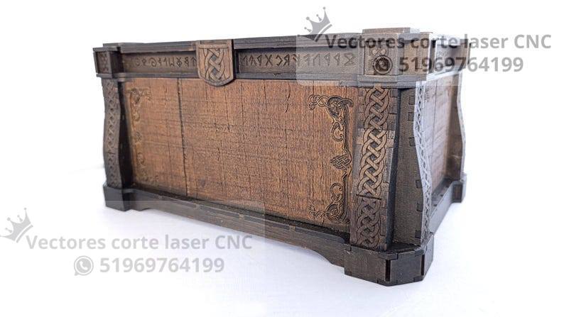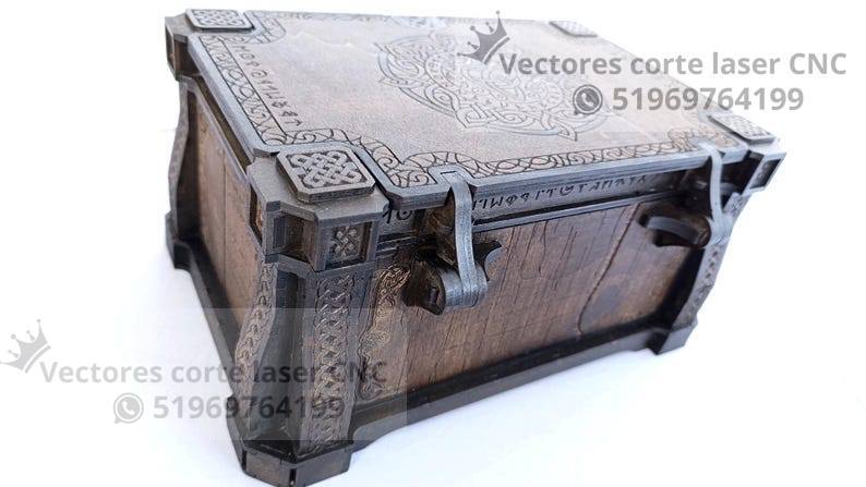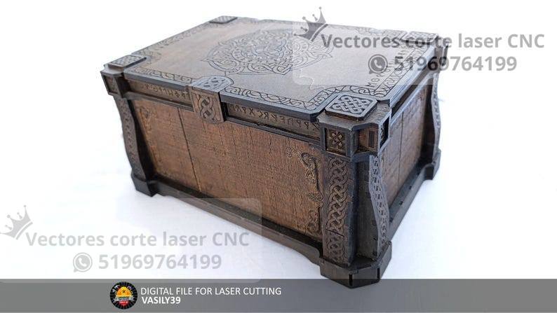 Un diseño impresionante inspirado en la estética celta, perfecto para crear un cofre decorativo elegante y robusto utilizando corte láser. Sus grabados ornamentales y detalles estructurales convierten esta pieza en un objeto ideal para regalos, almacenamiento de joyería o decoración artesanal.