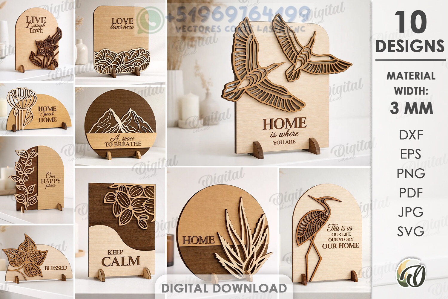 La madera habla cuando el diseño tiene intención. Esta colección de letreros decorativos 3D para hogar está pensada para transformar frases simples en piezas de alto valor visual, listas para producción con corte láser CNC en MDF de 3 mm.
