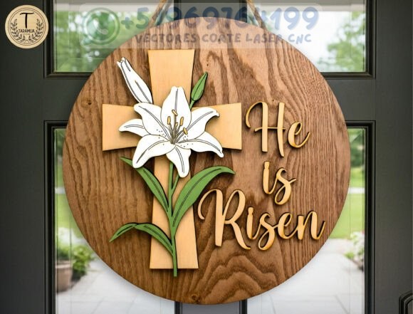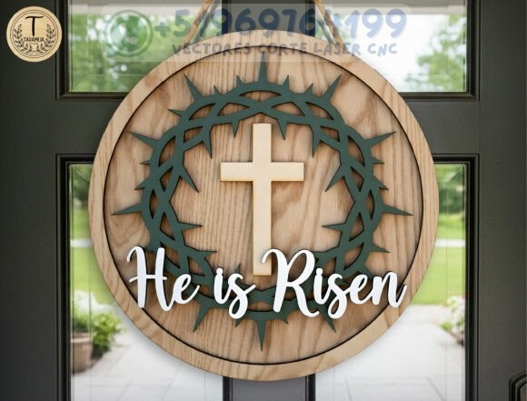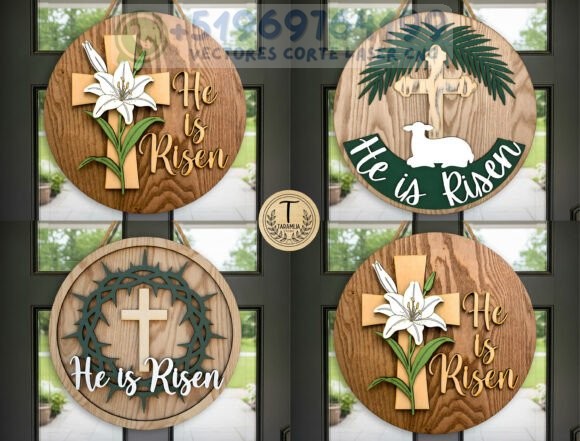 Este pack combina simbolismo cristiano con composición moderna en madera, integrando elementos como la cruz, la corona de espinas, el lirio blanco (símbolo de pureza y resurrección) y escenas del sepulcro vacío. Todo cuidadosamente diseñado en formato circular para lograr una pieza decorativa equilibrada y elegante.