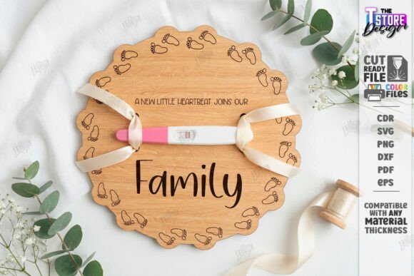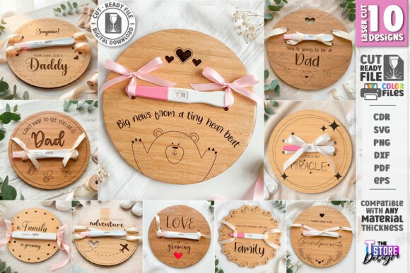 Este paquete de discos reveladores de embarazo en madera está creado para convertir una noticia íntima en un momento inolvidable. Los diseños se basan en placas circulares con grabados delicados, textos emotivos y espacios pensados para integrar una prueba de embarazo, cinta o pequeño accesorio, logrando un anuncio visualmente poderoso y lleno de significado.