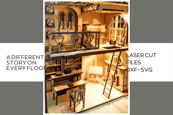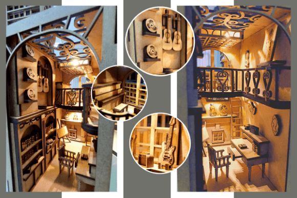 Convierte tu librero en una ventana mágica con esta Escena de Rincón de Lectura Book Nook en formato SVG, diseñada especialmente para corte láser. Cada detalle –desde las estanterías y escritorios hasta los instrumentos y barandales decorativos– crea una atmósfera única donde la imaginación cobra vida.