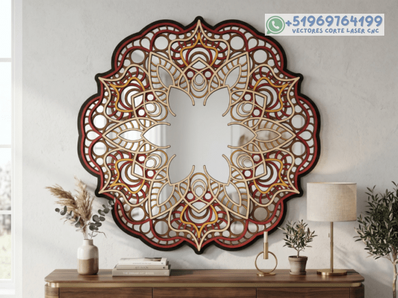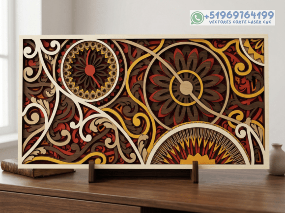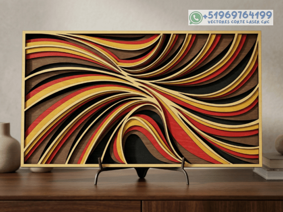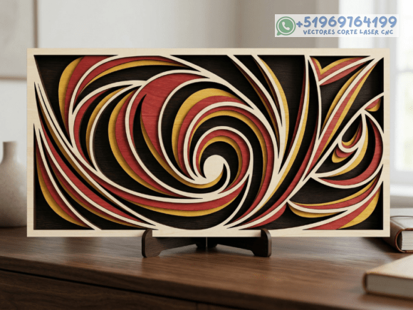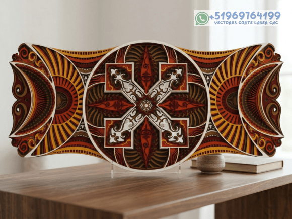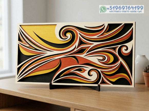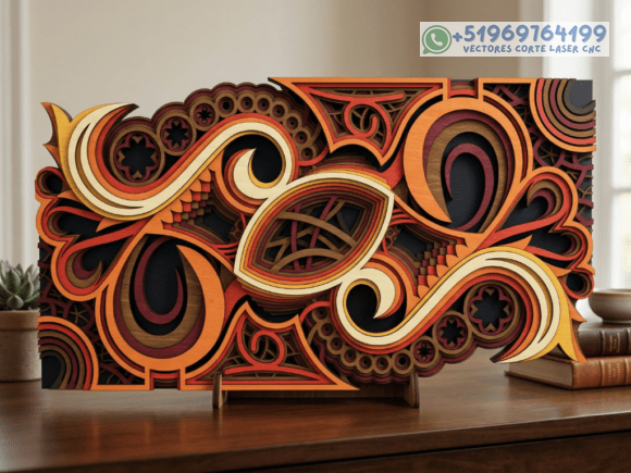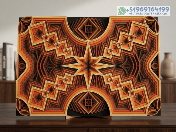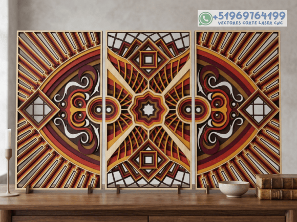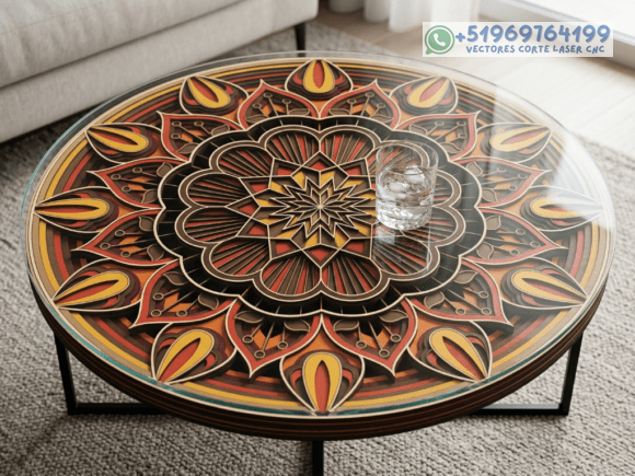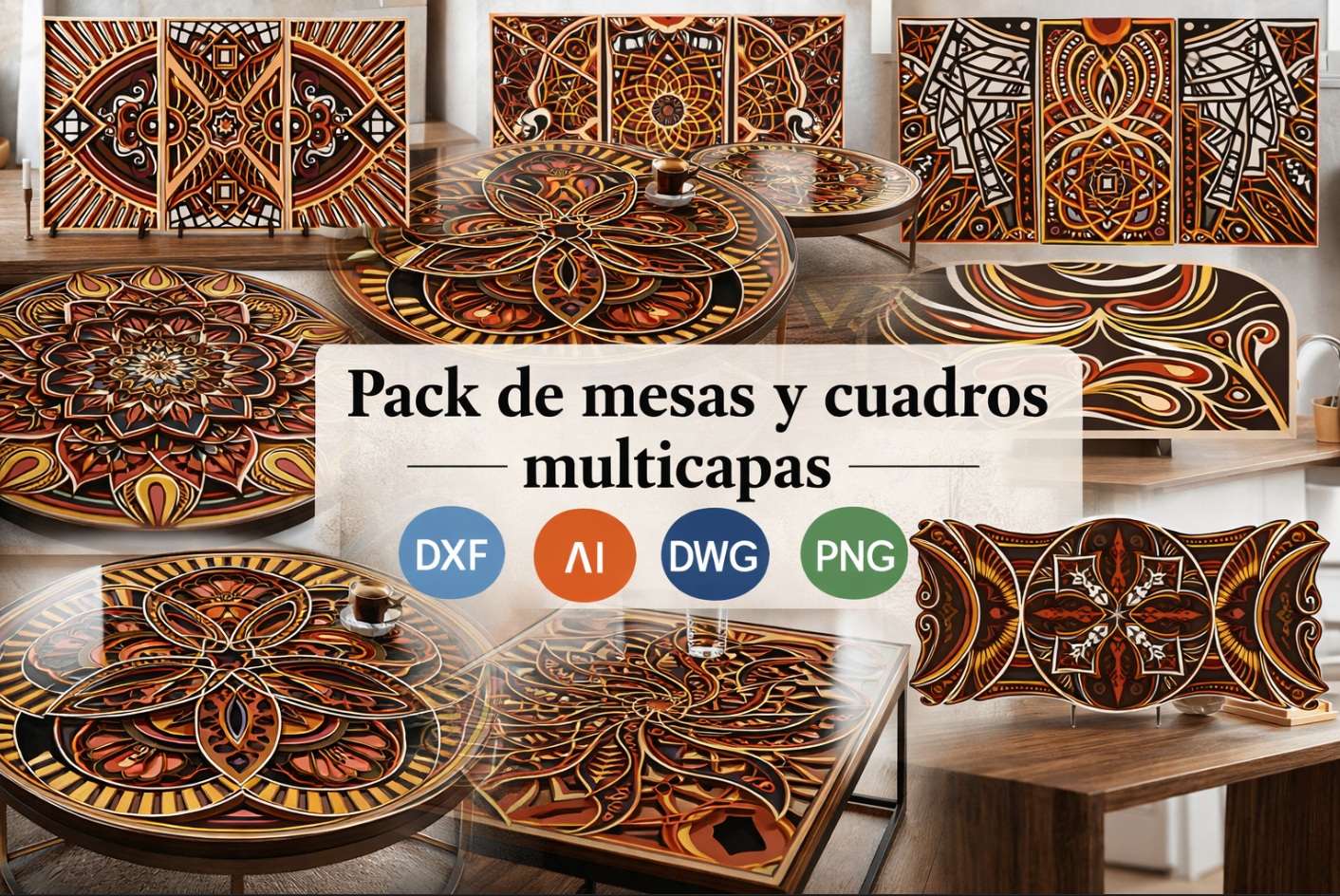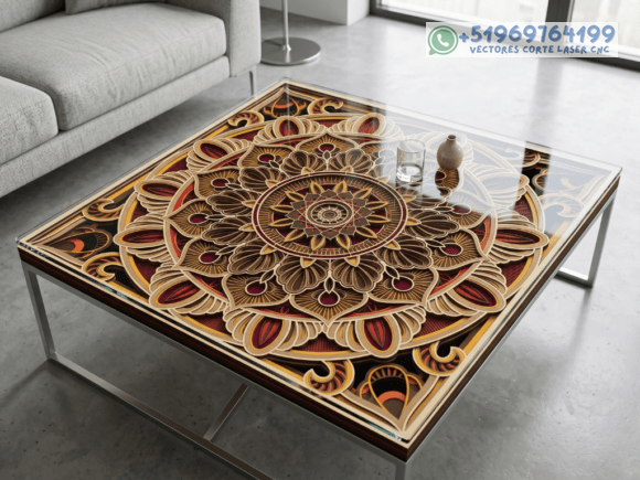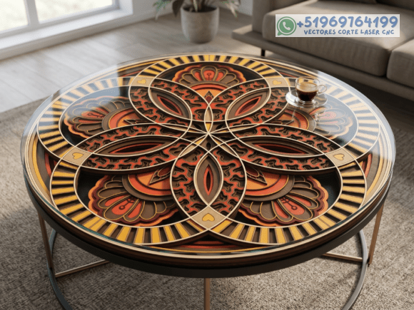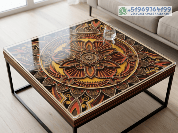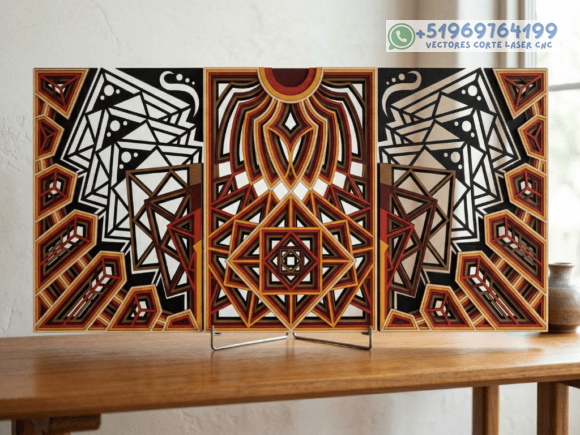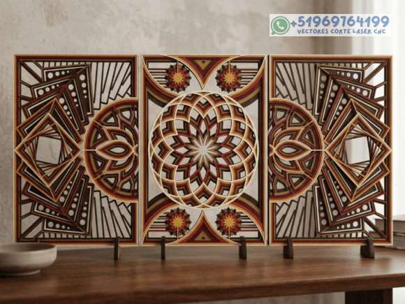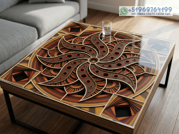 Este pack de mesas y cuadros multicapas en madera eleva el arte del corte láser a un nivel superior, combinando patrones geométricos, simetría y profundidad en piezas que capturan la mirada desde cualquier ángulo.