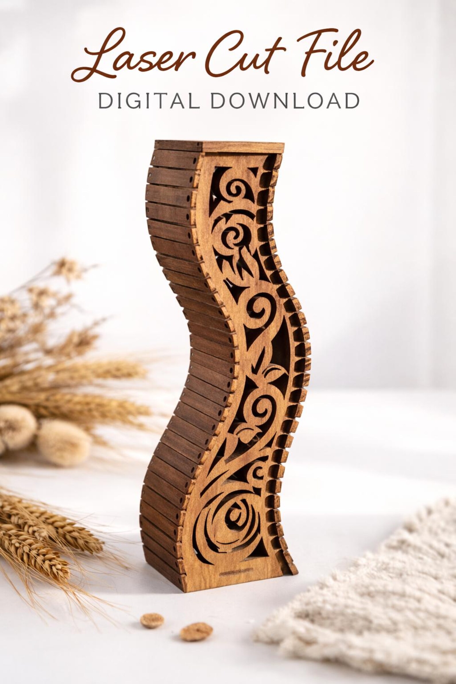 Este elegante jarrón floral curvo ha sido diseñado para destacar la belleza natural de la madera a través de líneas onduladas y un ensamblaje limpio. Es una pieza decorativa moderna, ideal para talleres de corte láser que buscan ofrecer productos diferenciados, decorativos y de alta rotación.