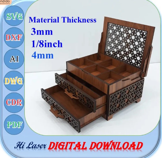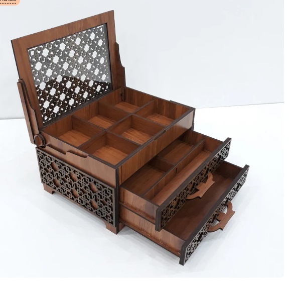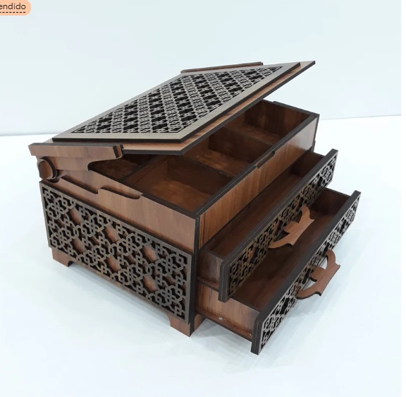 Este diseño está pensado para quienes buscan elegancia, funcionalidad y alto valor percibido en un solo proyecto. Un joyero estructurado, con cajones deslizables y compartimientos internos, ideal para piezas decorativas, regalos personalizados o productos de venta premium en madera.