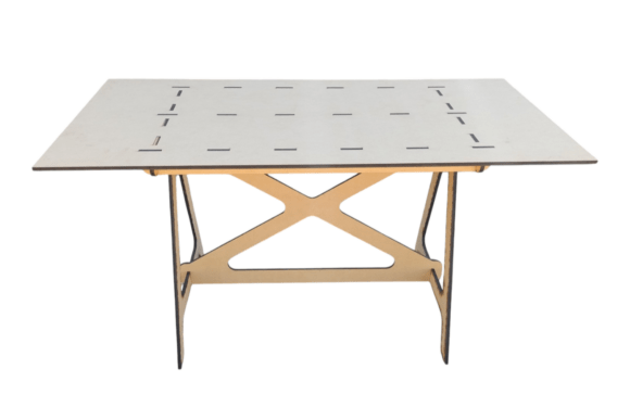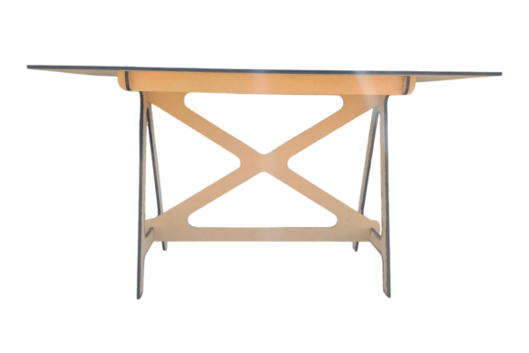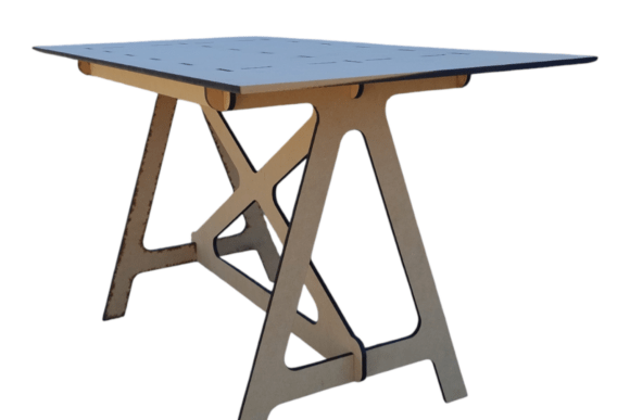 El vector permite fabricar una mesa estable y desmontable, ideal para MDF, triplay o madera sólida, con un sistema de patas geométricas en forma de X estructural, que distribuye el peso y aporta una estética contemporánea sin tornillos visibles.