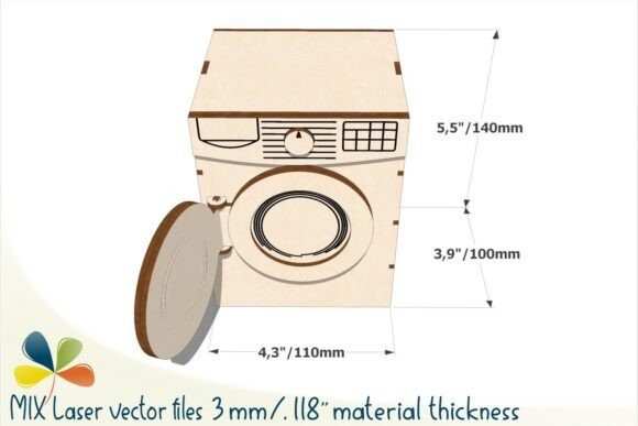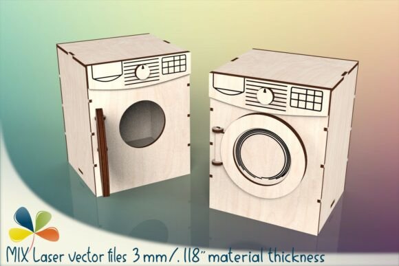 Este diseño de lavadora miniatura para casa de muñecas está pensado para crear piezas realistas, funcionales y llenas de encanto mediante corte láser.