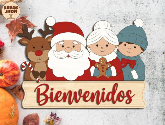 El conjunto incluye Papá Noel, Mamá Noel, un niño abrigado y un reno navideño, todos colocados sobre una base con el texto “Bienvenidos”, creando una composición equilibrada, ideal para decoración de puertas, paredes o entradas durante la temporada navideña.