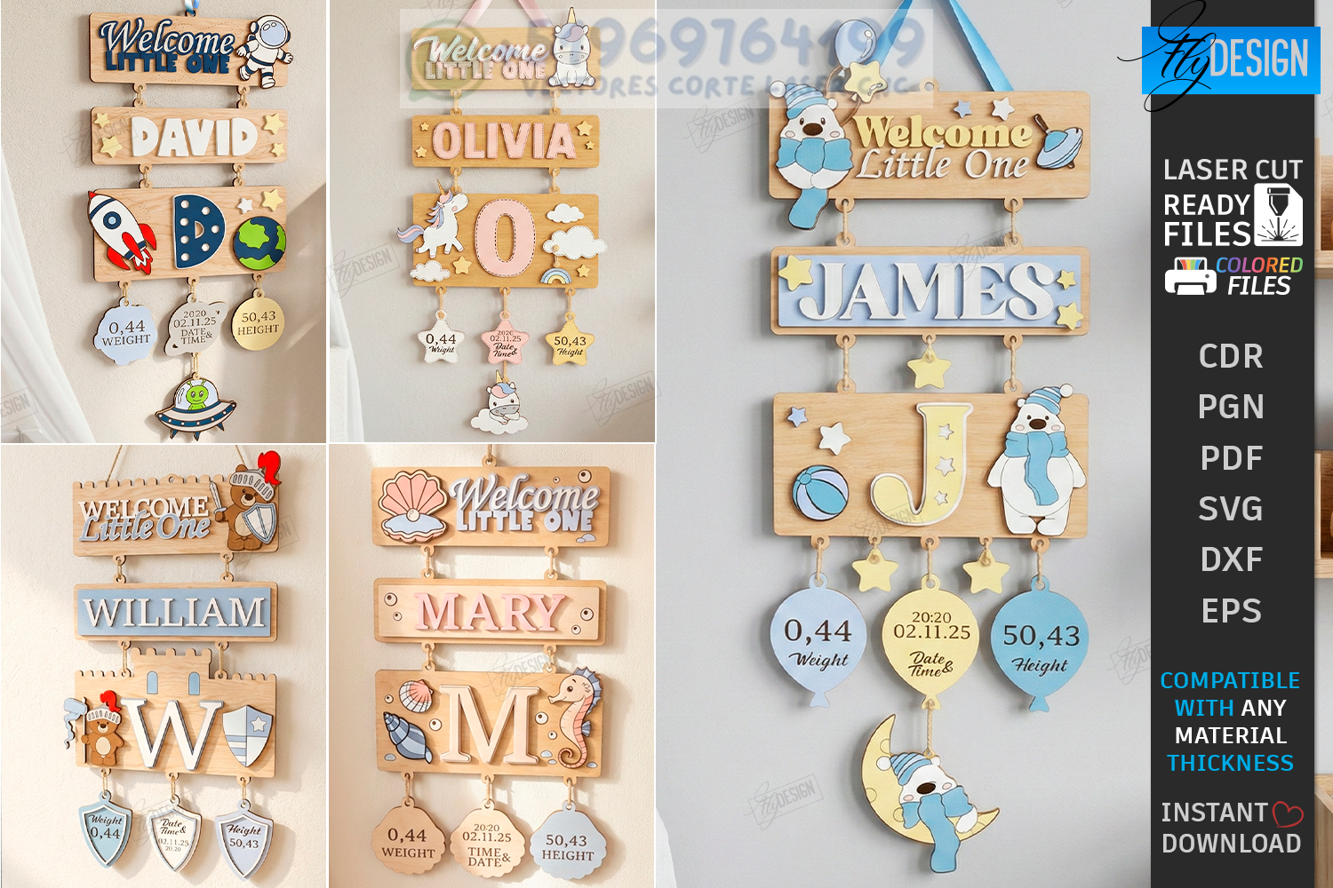 Este letrero decorativo en capas 3D para recién nacidos está diseñado para corte láser en MDF o acrílico, con sistema modular que permite personalizar nombre, inicial y datos de nacimiento.