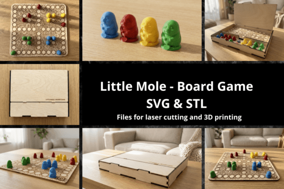 Little Mole es un juego de mesa físico diseñado para fabricarse en madera mediante corte láser y complementarse con piezas impresas en 3D, ideal para familias, aulas y talleres creativos.