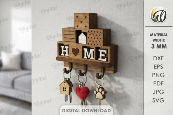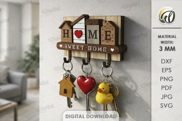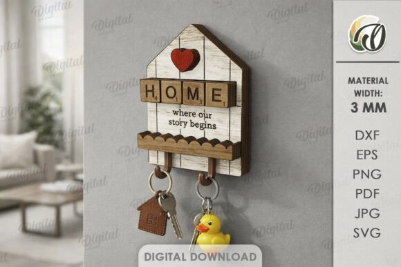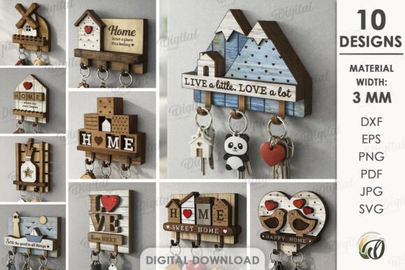 El conjunto está pensado en capas, con volúmenes simples pero expresivos: fachadas, ventanas, corazones, mini figuras y ganchos funcionales que se integran al diseño. Ideal para fabricar en madera o MDF, funciona tanto como objeto práctico como elemento decorativo para entradas, pasillos o talleres creativos.