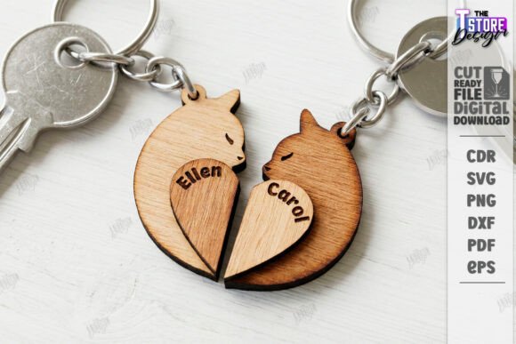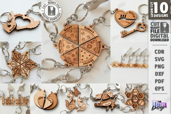 El set incluye llaveros circulares divididos en secciones, llaves, corazones, figuras geométricas y siluetas decorativas, todos optimizados para grabado de nombres o símbolos. Algunos diseños funcionan de manera individual y otros cobran sentido al unirse, creando un concepto visual fuerte y muy vendible.