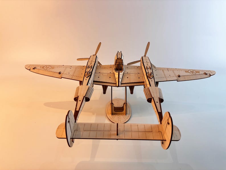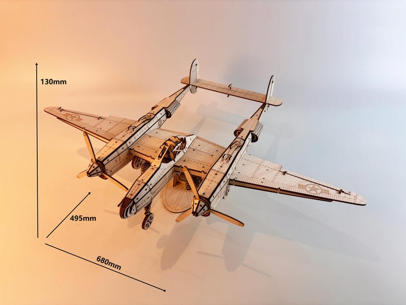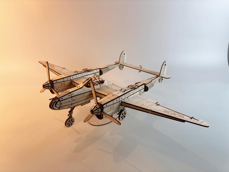 Revive la historia y la elegancia del P-38 con este modelo en madera de precisión láser, una pieza que combina ingeniería artesanal y diseño artístico en perfecta armonía.