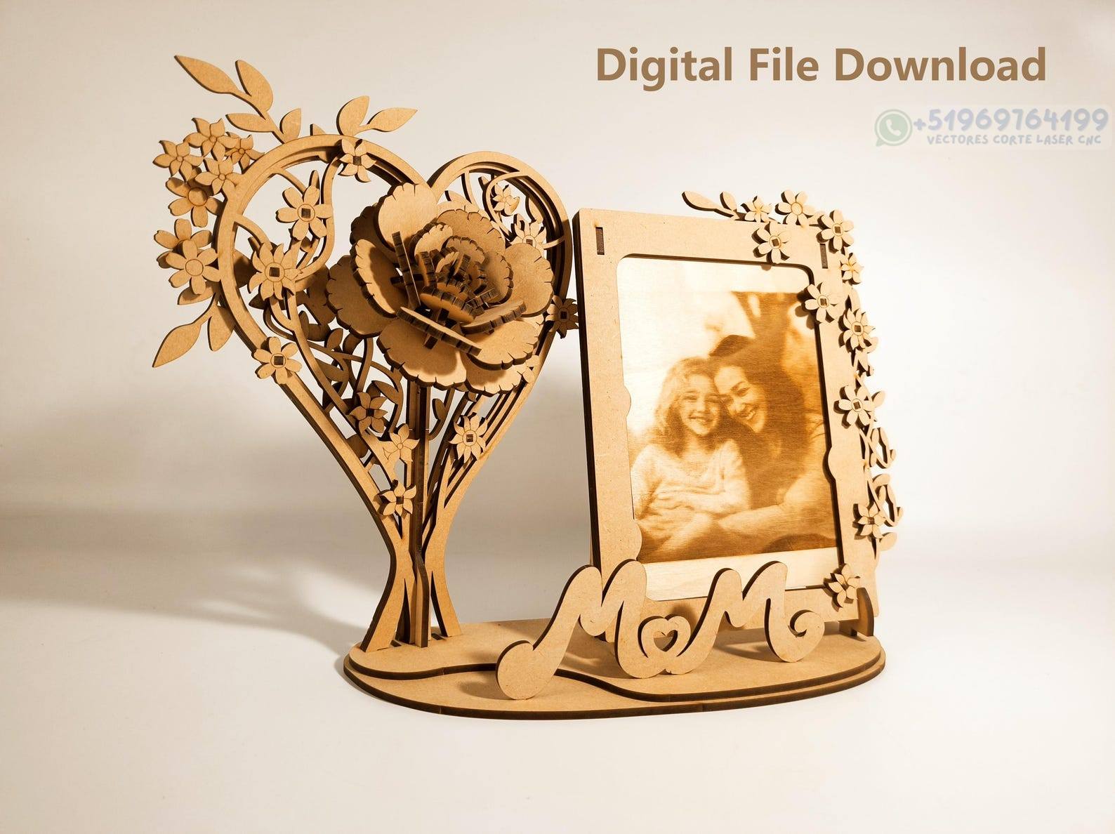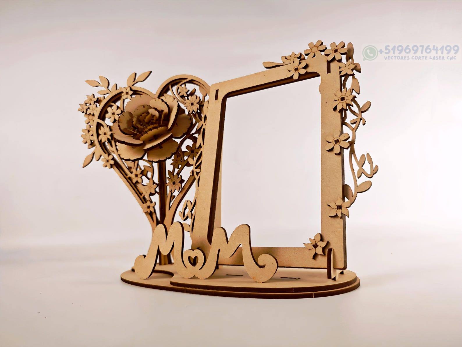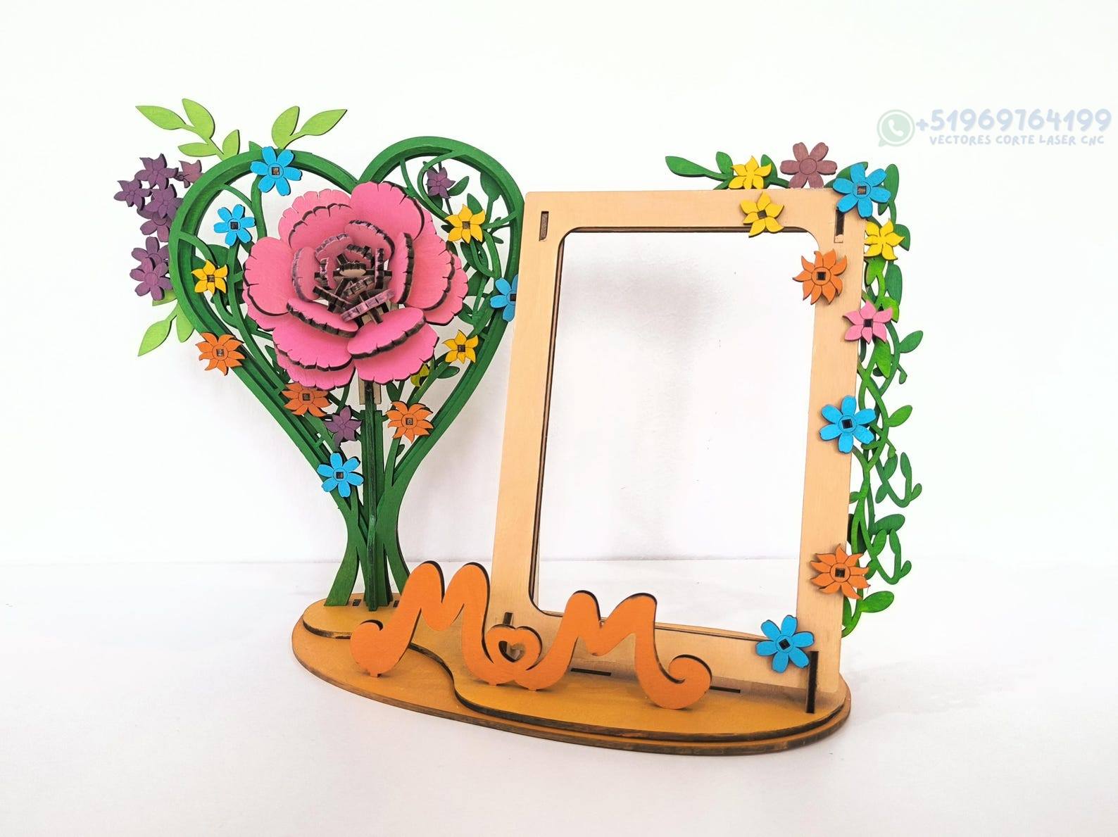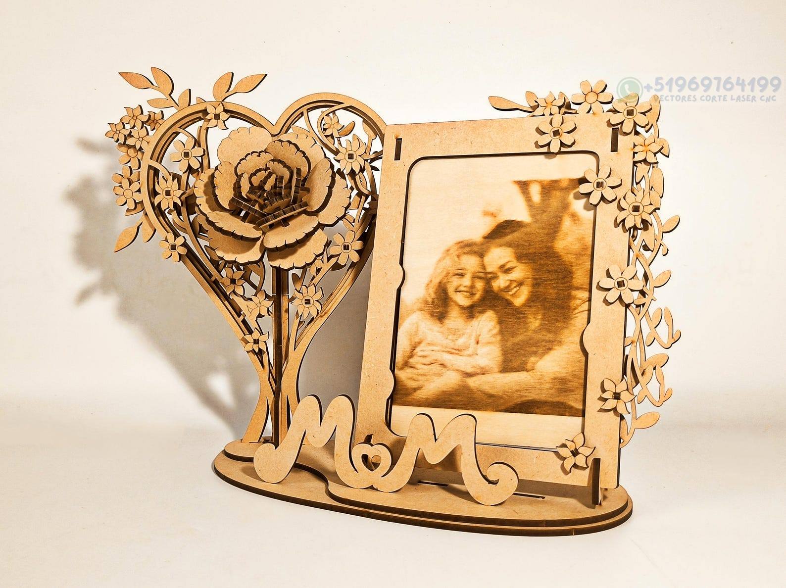 Un diseño elegante y emotivo que combina un marco de fotos con un corazón floral tridimensional, perfecto para crear recuerdos personalizados llenos de significado. La composición incluye detalles de flores, un corazón decorativo y una base con la palabra MOM, ideal para regalos familiares o decoración especial.