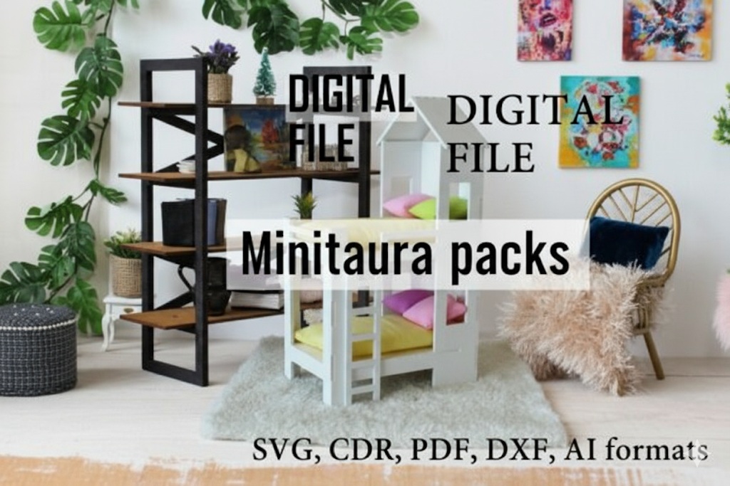 Decora y dale vida a tu casa de muñecas con este paquete exclusivo de muebles en miniatura. Diseños modernos y detallados en escala 1:6, ideales para proyectos de corte láser en madera, MDF o acrílico. Incluye camas, estantes, mesas y mucho más, todo en archivos digitales de alta calidad.