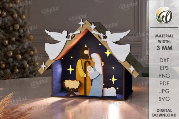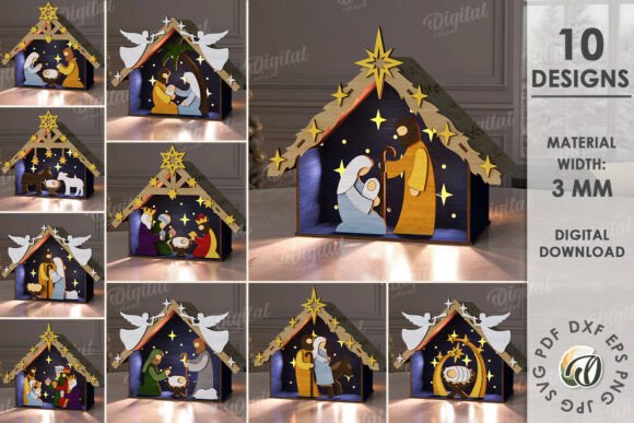 Celebra la magia de la Navidad con este set de nacimientos navideños en casita 3D, ideales para corte láser y perfectos para crear decoraciones iluminadas con un toque cálido y artesanal. Cada modelo muestra la escena del pesebre con estilos distintos, ángeles, estrellas y detalles que resaltan al agregar luz LED en su interior.