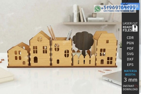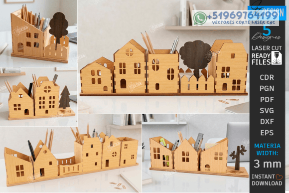 Organizador Porta Lápices “Village” – 5 Diseños Creativos para Corte Láser