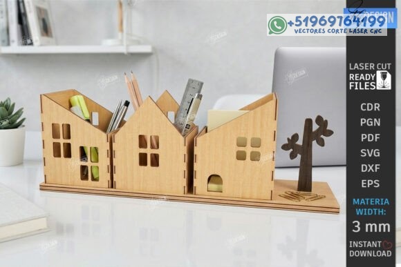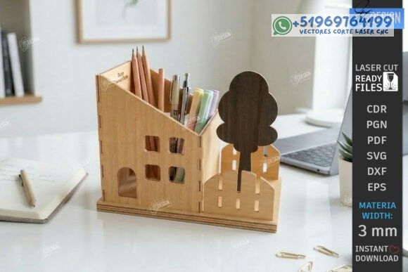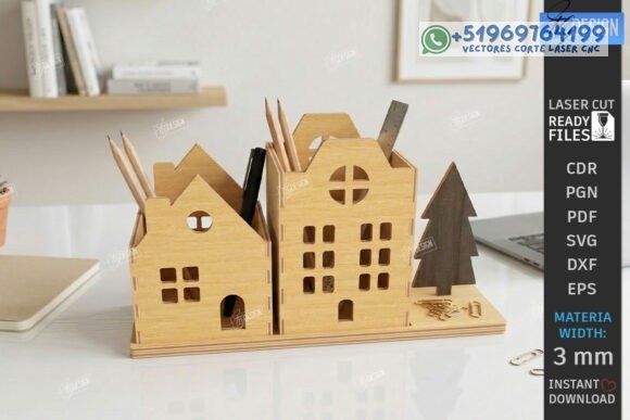 Archivos en CDR, PNG, PDF, SVG, DXF y EPS, compatibles con LightBurn, CorelDRAW, Illustrator y máquinas CNC de corte láser. Perfecto para crear organizadores de escritorio, porta lápices decorativos, accesorios de oficina en madera, mini ciudad decorativa y productos artesanales funcionales para venta.