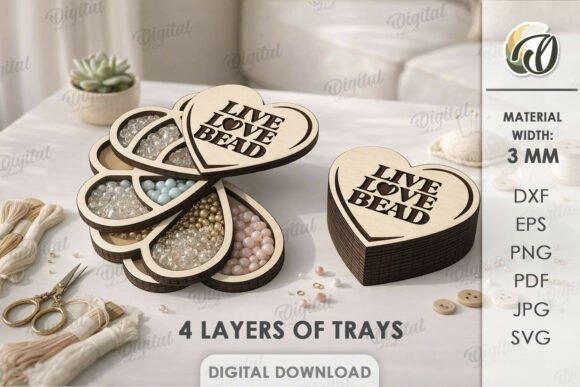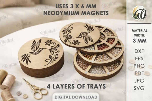 Los diseños se basan en cajas apilables y modulares, con compartimentos hexagonales y circulares, tapas grabadas y estructuras en capas que aportan profundidad y resistencia. Cada forma está pensada para maximizar el espacio y facilitar el acceso a cuentas, hilos, botones o accesorios pequeños.