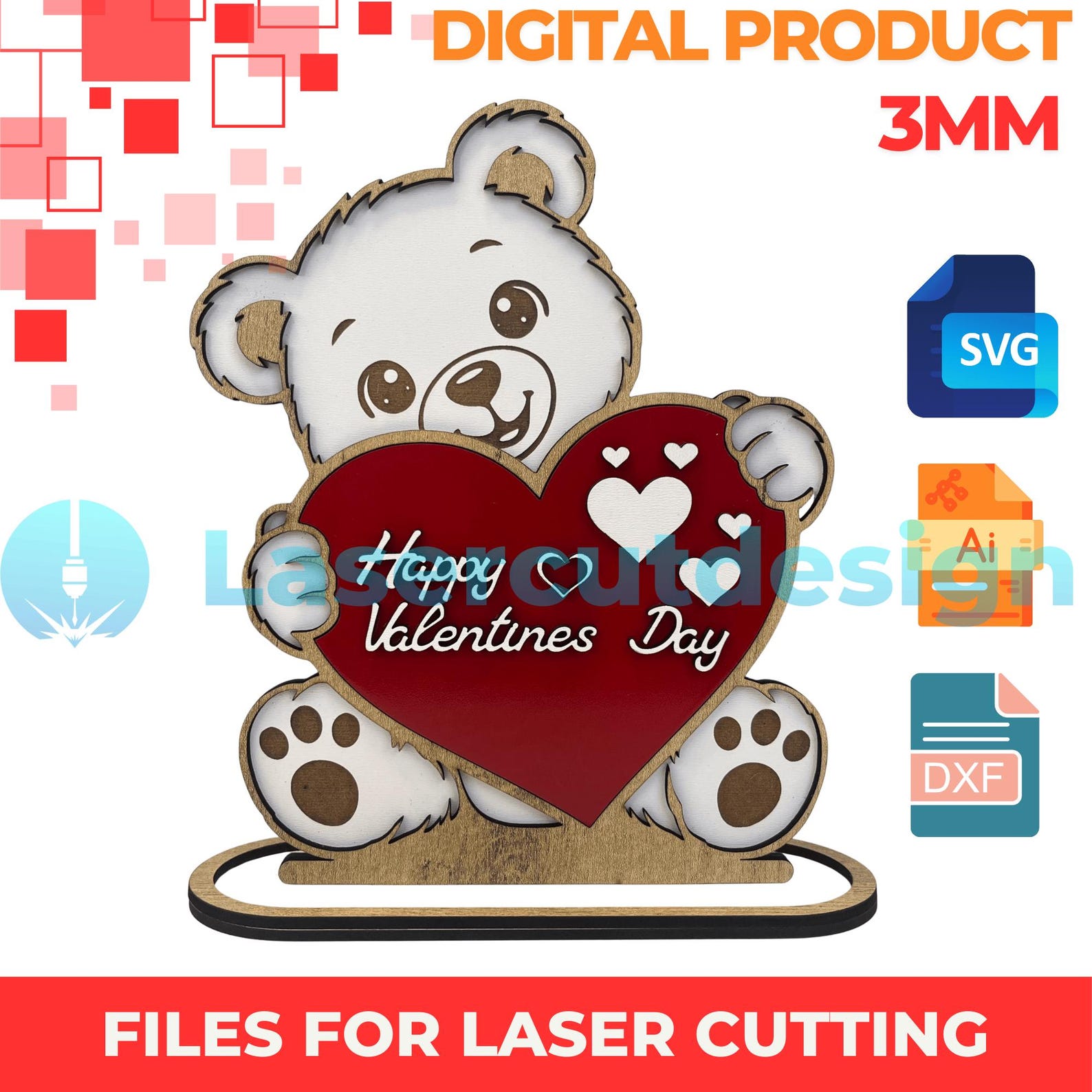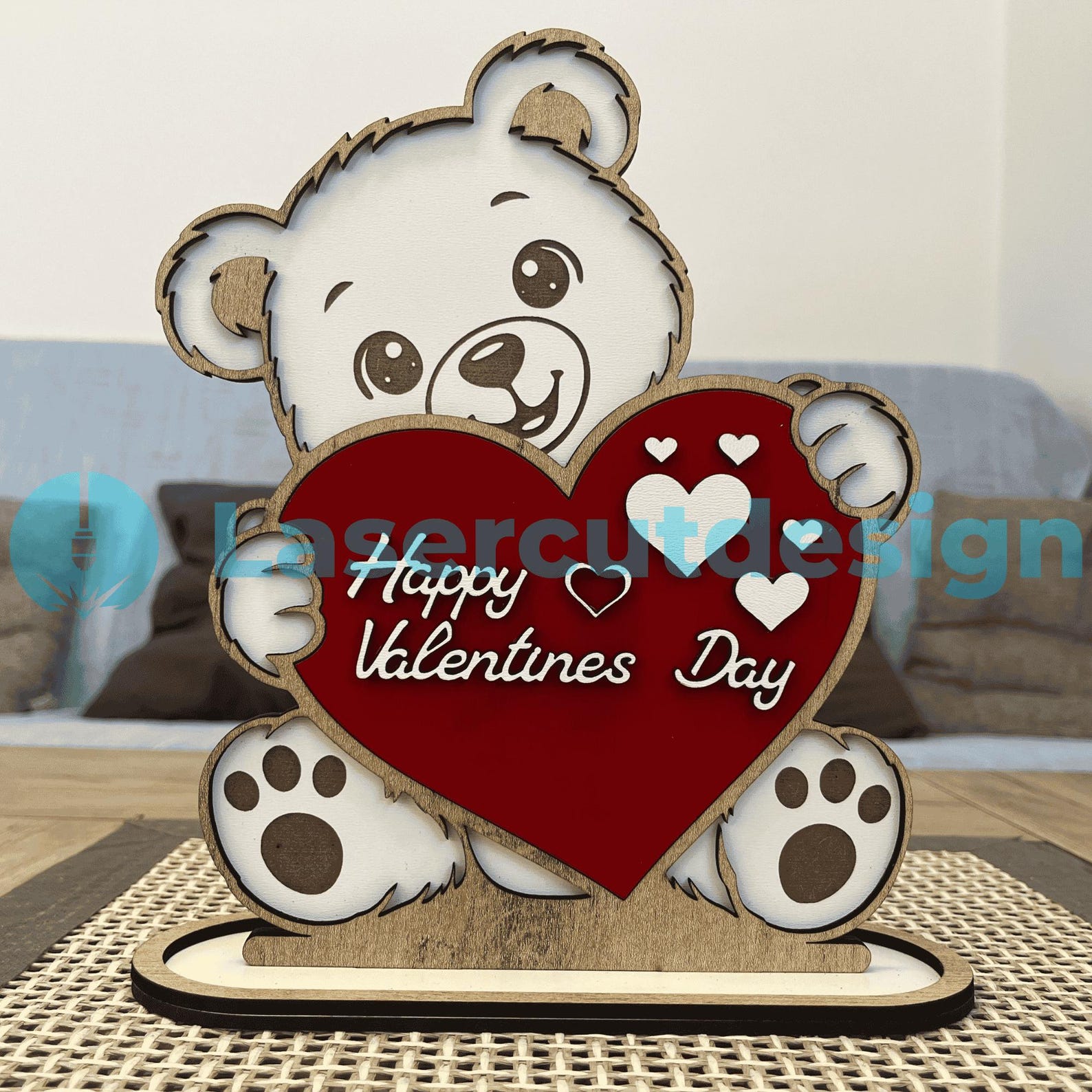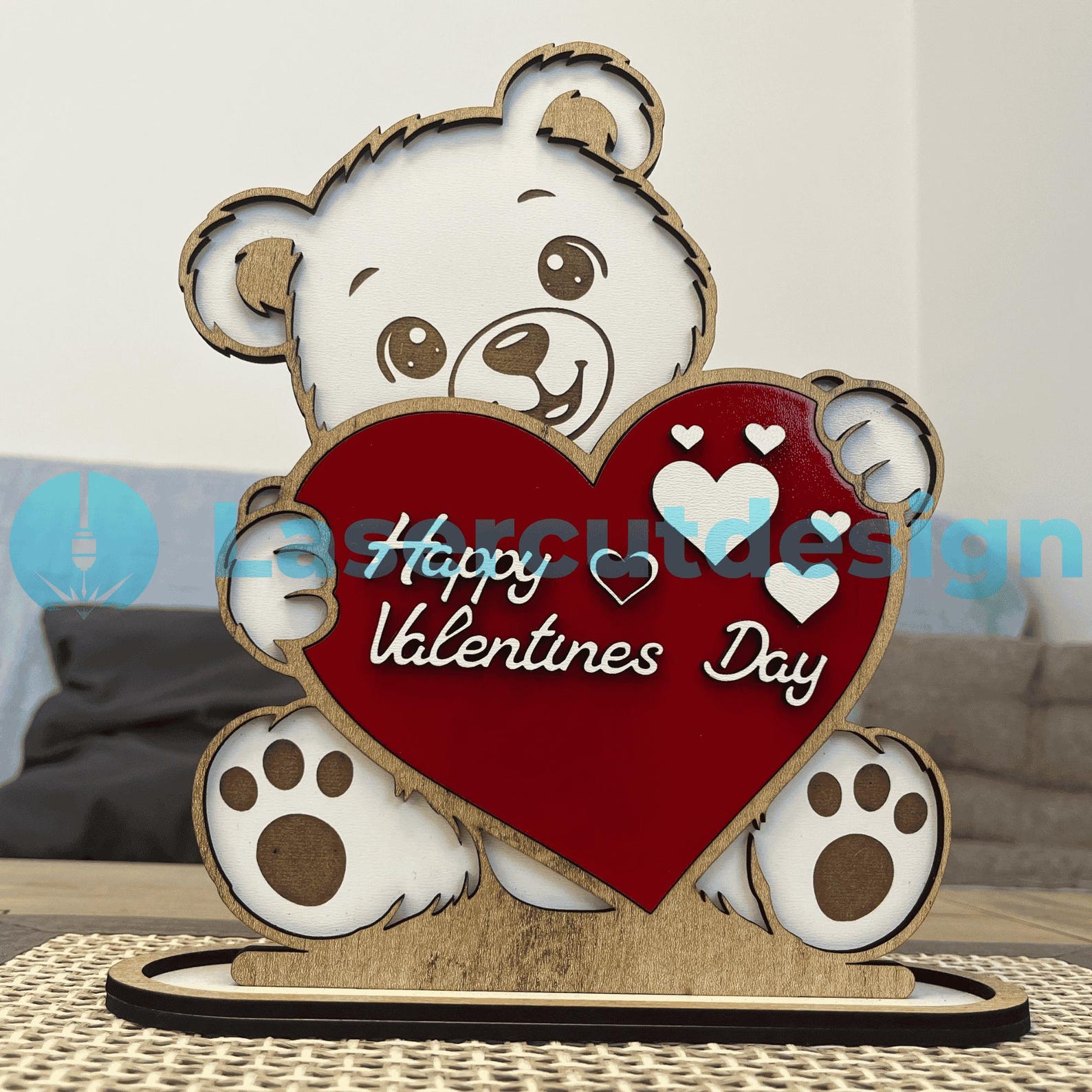 Pensado para madera MDF o triplay de 3 mm, el diseño destaca por sus capas limpias, cortes precisos y una presencia visual que llama la atención incluso a distancia.
