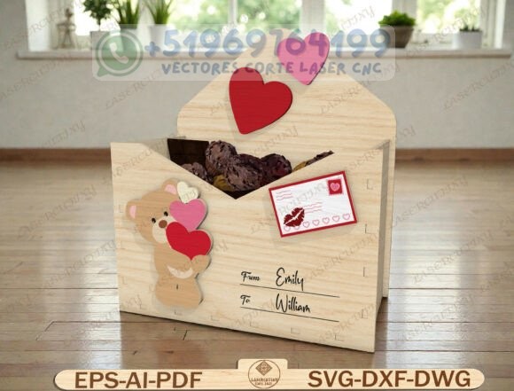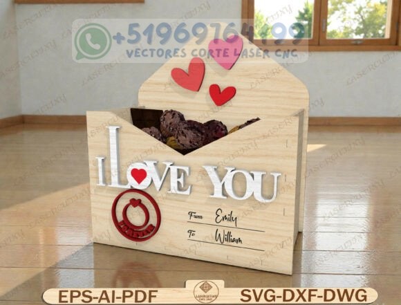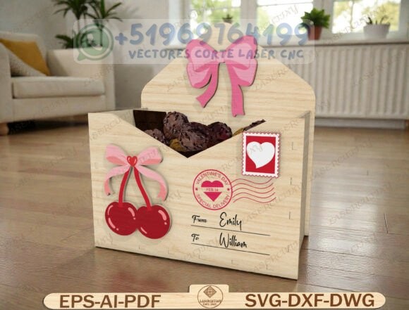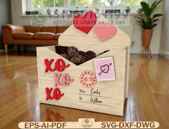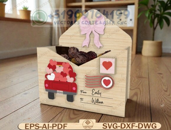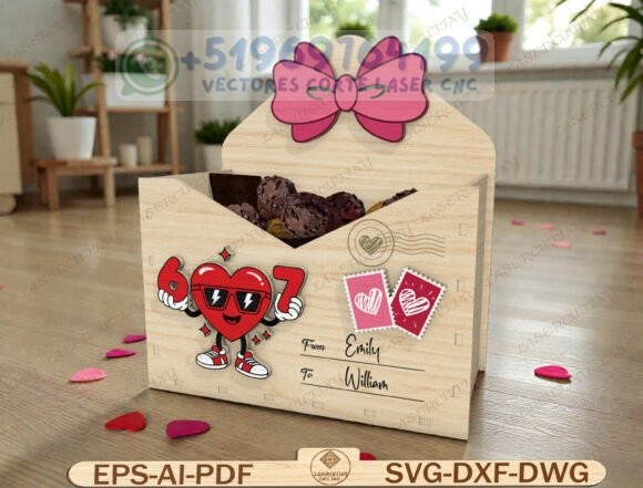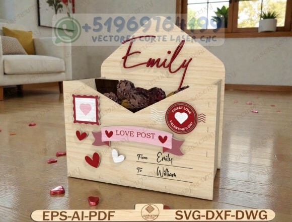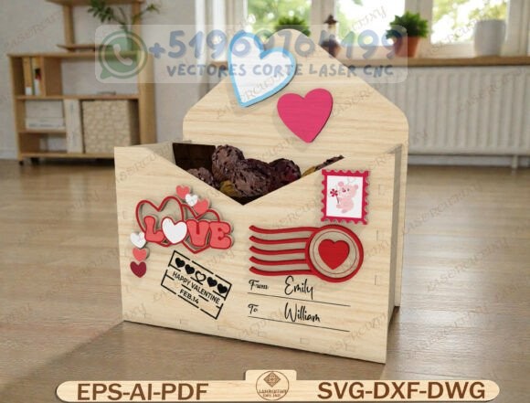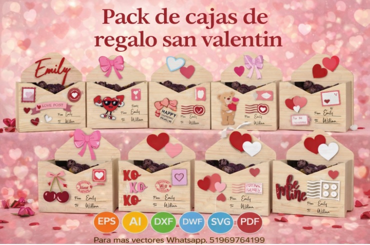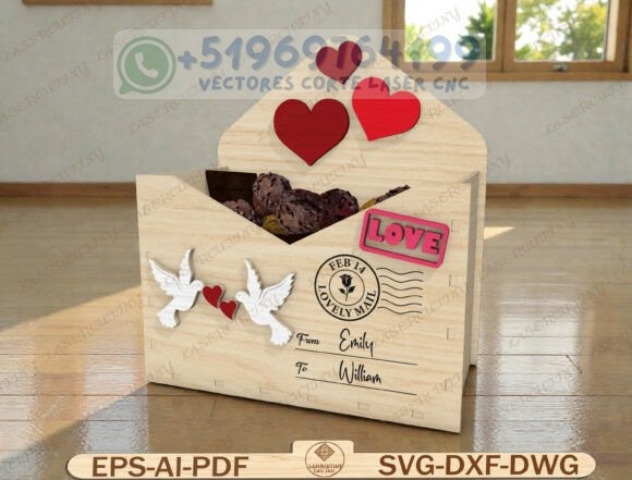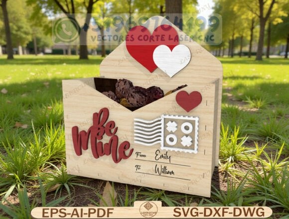 Este pack reúne una colección de cajas tipo sobre romántico en madera, diseñadas para corte láser y CNC, perfectas para chocolates, dulces, cartas o pequeños detalles personalizados.