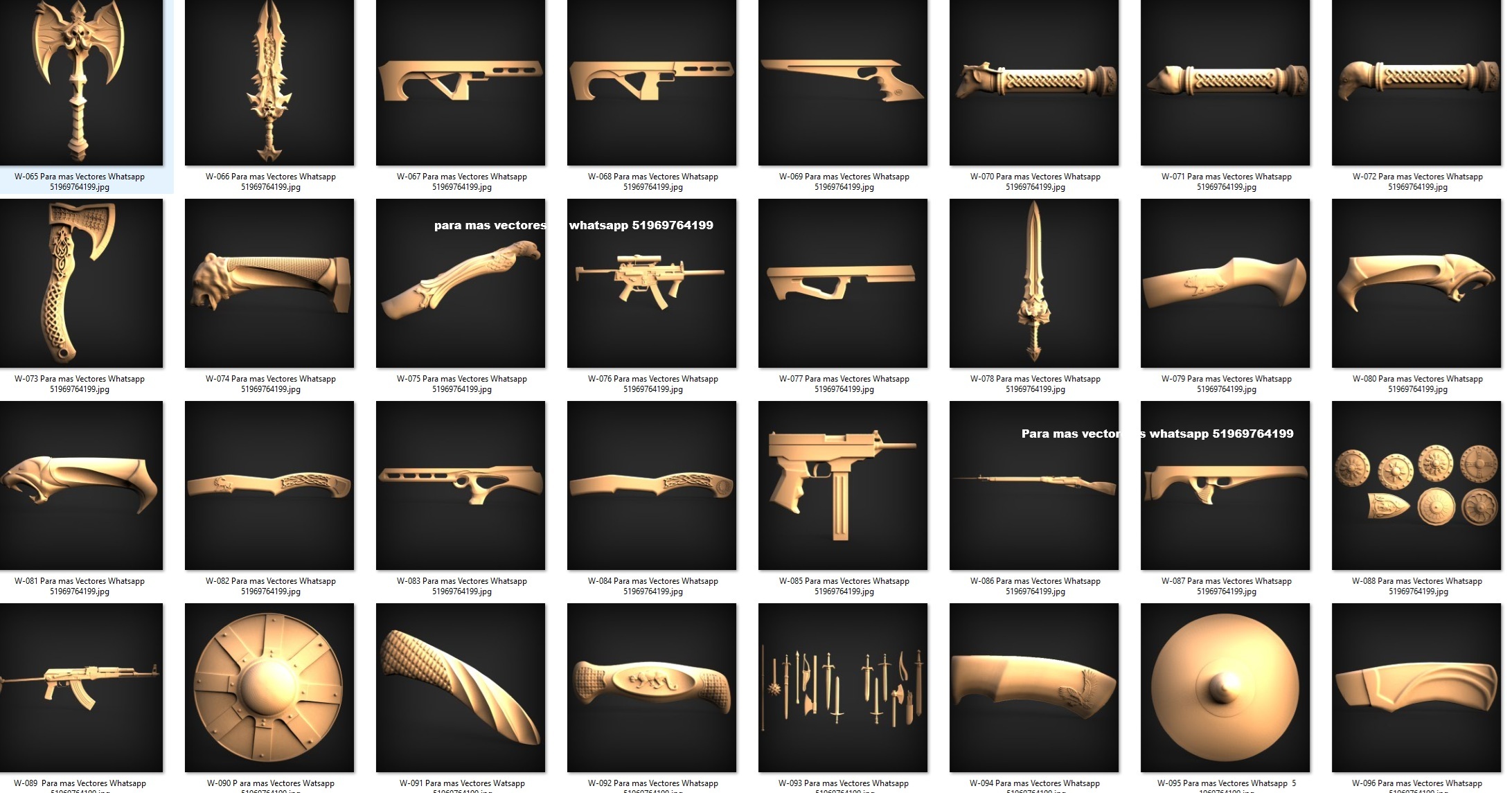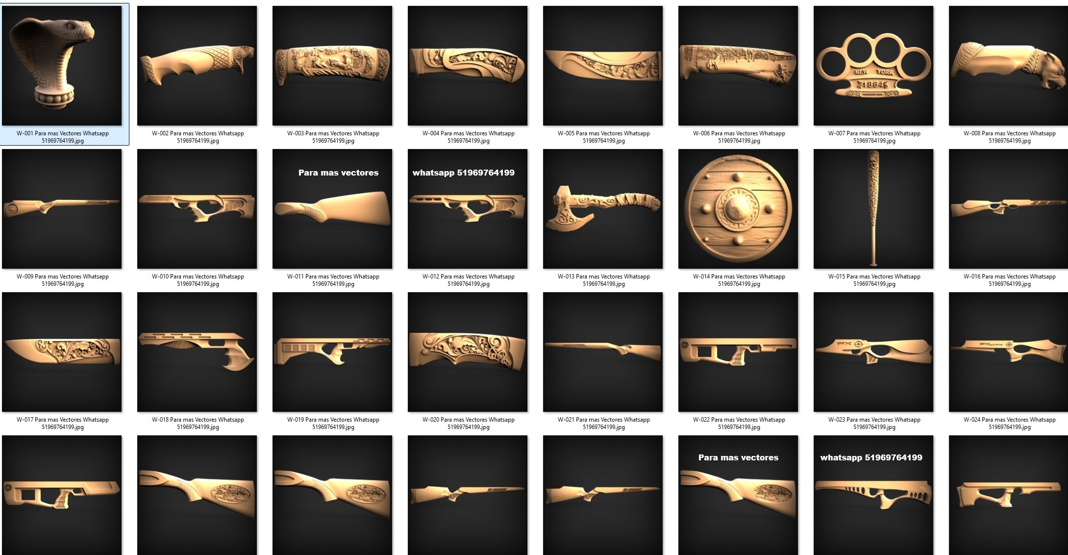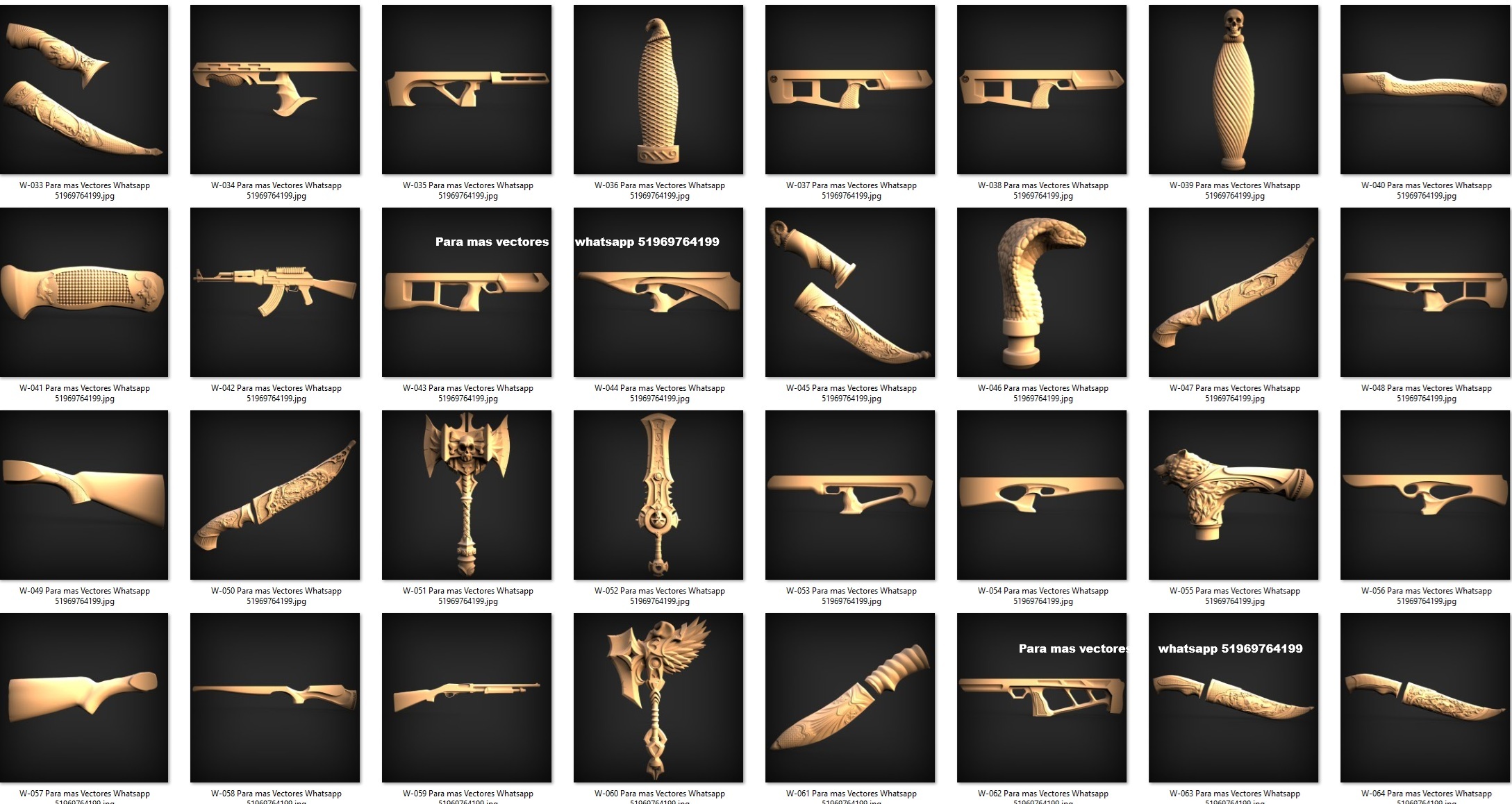 El conjunto incluye mangos ergonómicos, empuñaduras talladas, hachas decorativas, cuchillos de fantasía y elementos inspirados en estilos medievales y modernos. Cada forma está diseñada con curvas precisas, relieves profundos y proporciones equilibradas, ideales para destacar vetas, sombras y volúmenes durante el mecanizado.
