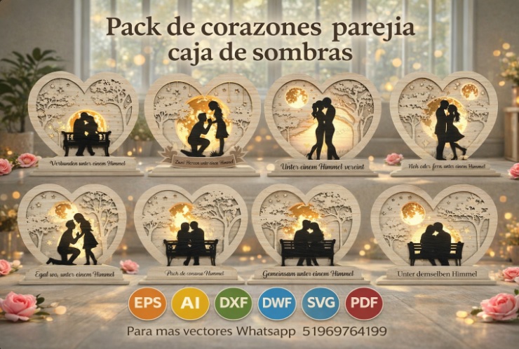 Este pack reúne una colección de corazones en formato shadow box (caja de sombras) diseñados especialmente para corte láser y CNC. Cada pieza combina capas superpuestas de madera que crean profundidad visual, siluetas románticas y un efecto cálido perfecto para integrar iluminación LED.