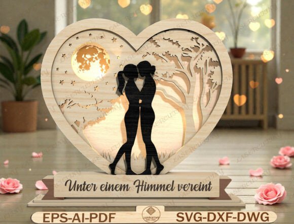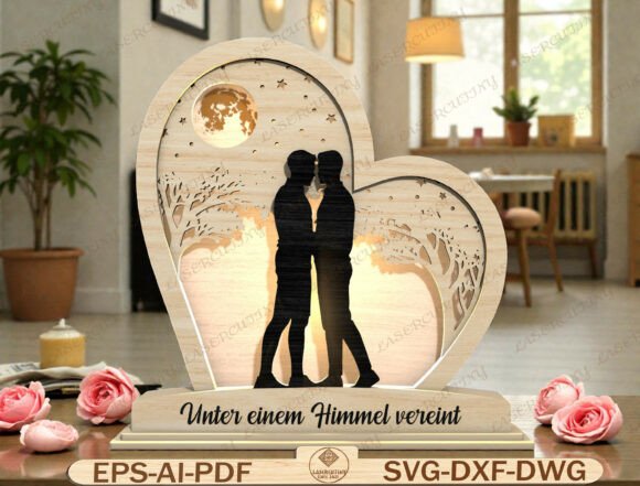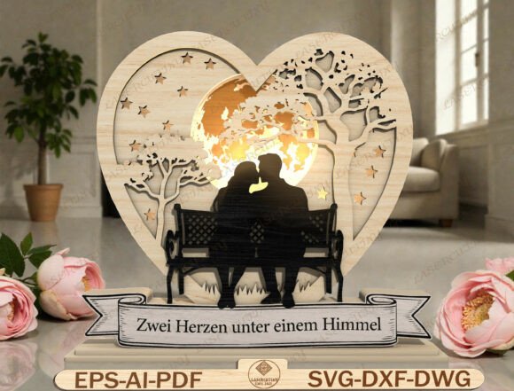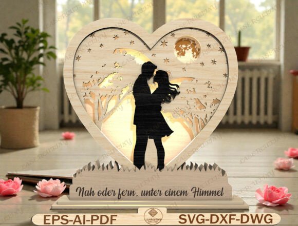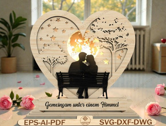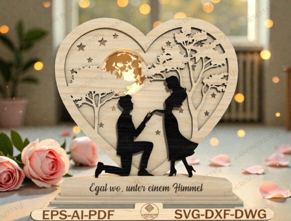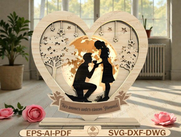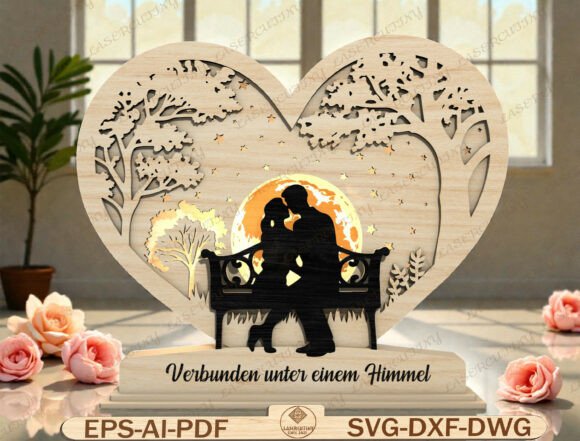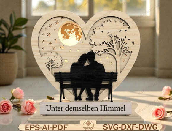 Los diseños incluyen escenas de pareja: propuestas, abrazos, momentos en banca bajo la luna y composiciones íntimas que transmiten conexión y sentimiento. Todo enmarcado dentro de un corazón estructural, con fondo decorativo de árboles, cielo nocturno y elementos naturales que potencian el efecto tridimensional.