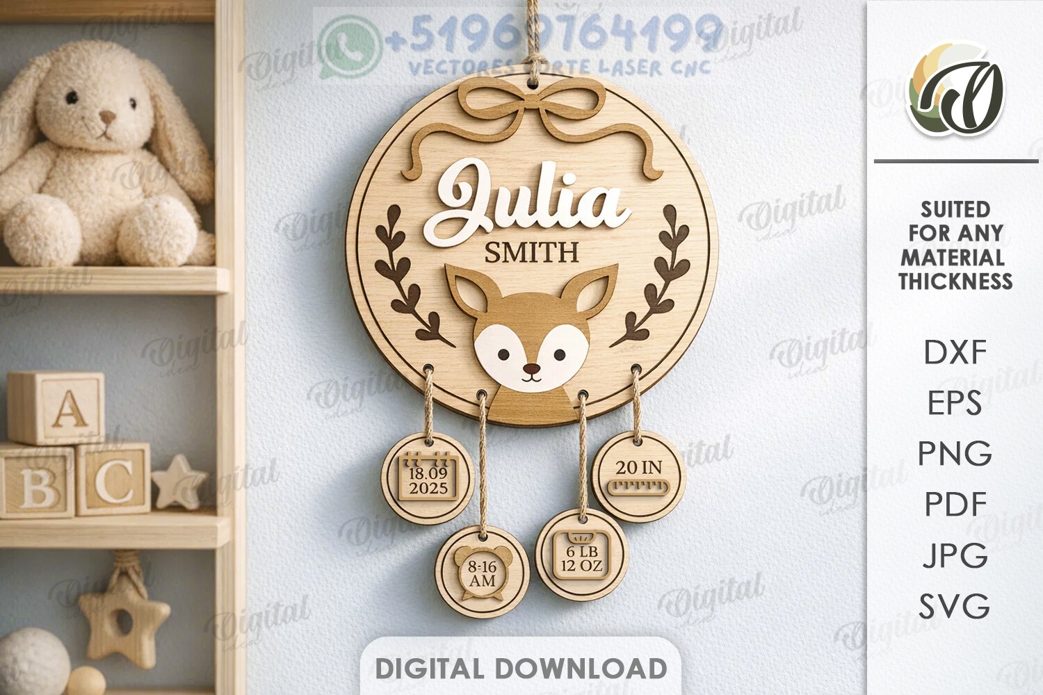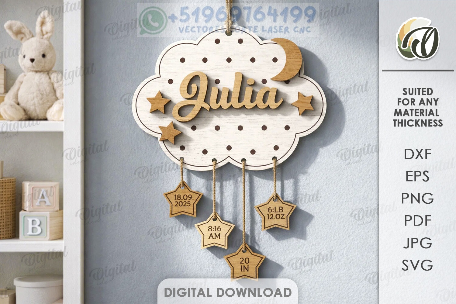 Archivos en SVG, DXF, EPS, PNG y PDF, compatibles con LightBurn, CorelDRAW, Illustrator y máquinas de corte láser CNC. Diseños optimizados para MDF, madera o acrílico, ideales para fabricar decoración infantil, recuerdos de nacimiento y productos personalizados para baby shower.