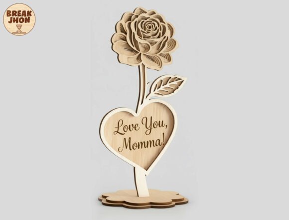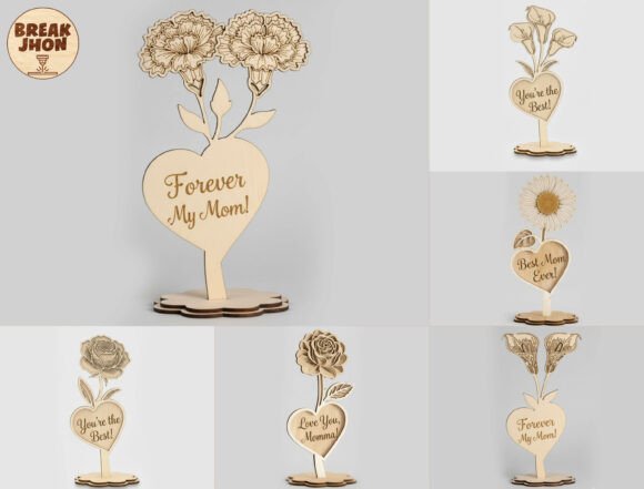 Cada diseño presenta flores delicadamente grabadas que emergen desde una base en forma de corazón, acompañadas por mensajes especiales dedicados a mamá. Al fabricarse en MDF, madera o acrílico, estas piezas se convierten en un regalo decorativo lleno de significado.