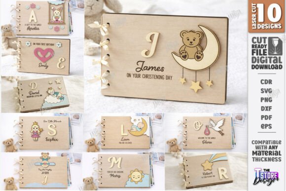 Pack de álbumes de fotos personalizados para bebé para corte láser, incluye 10 diseños de portadas infantiles con ositos, lunas, estrellas, angelitos y nombres personalizados, ideales para fabricar álbumes de recuerdos en madera para nacimientos y bautizos.