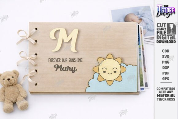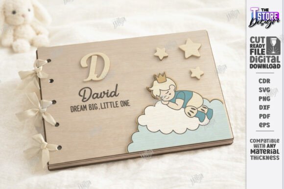 Archivos en SVG, DXF, EPS, PNG, PDF y CDR, compatibles con LightBurn, CorelDRAW, Illustrator y máquinas CNC de corte láser. Diseños perfectos para crear álbumes de bebé personalizados, regalos de nacimiento, recuerdos de bautizo y productos artesanales para baby shower.
