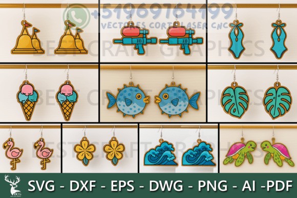 Agrega color y diversión a tu catálogo con este exclusivo paquete de aretes veraniegos para corte láser, ideal para quienes aman la creatividad, el sol y el estilo artesanal. Este set incluye más de 12 diseños únicos inspirados en el verano: desde helados y peces tropicales hasta olas, tortugas, pistolas de agua y hojas monstera.