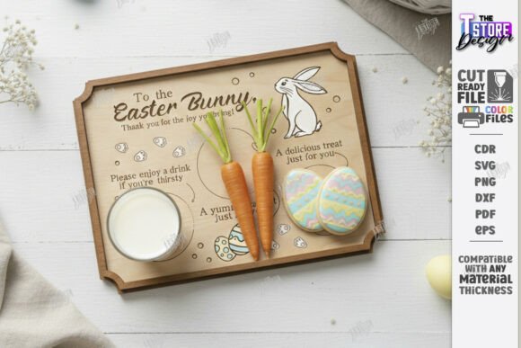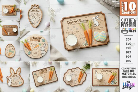 Cada bandeja presenta formas temáticas inspiradas en el conejo de Pascua, con espacios especiales para colocar zanahorias, galletas o golosinas, acompañadas de ilustraciones y mensajes decorativos. Son perfectas para crear una experiencia especial en casa o para vender como producto artesanal durante la temporada de Pascua.