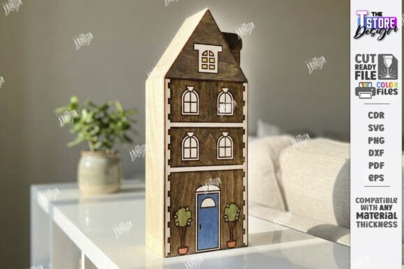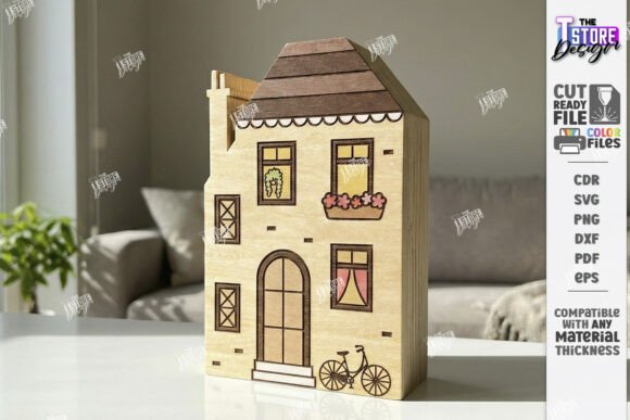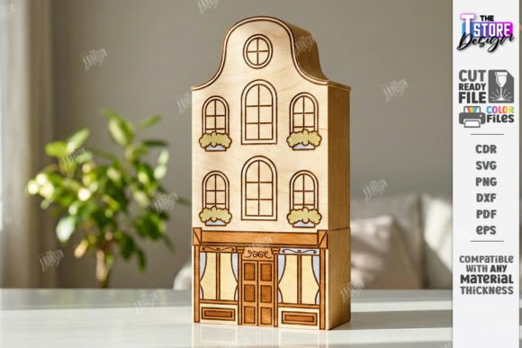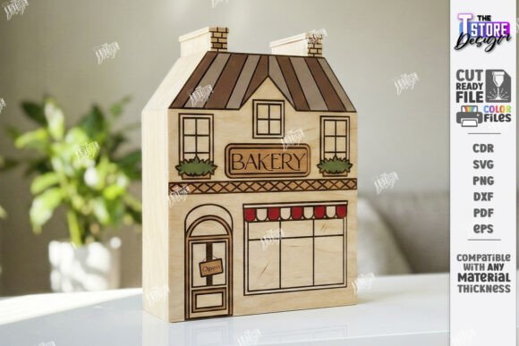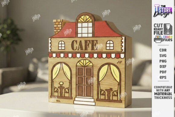Archivos en CDR, SVG, PNG, DXF, PDF y EPS, compatibles con LightBurn, CorelDRAW, Illustrator y máquinas CNC de corte láser. Perfecto para crear decoración de casas miniatura, maquetas urbanas artesanales, decoración de repisas estilo pueblo y productos artesanales para venta.