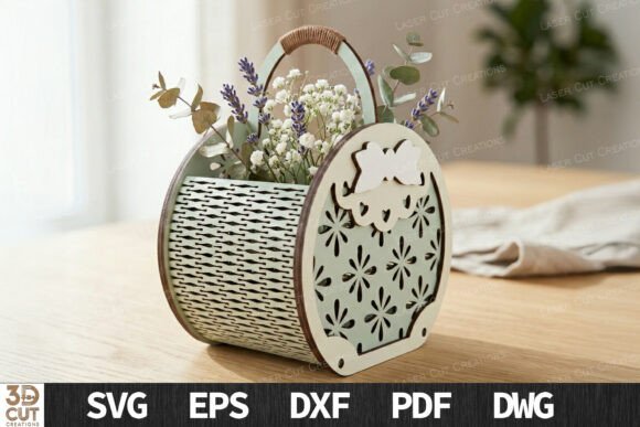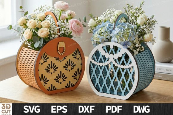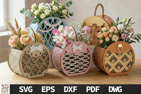 Archivos en SVG, EPS, DXF, PDF y DWG, compatibles con LightBurn, CorelDRAW, Illustrator y máquinas CNC de corte láser. Diseños perfectos para crear cestas decorativas de madera, centros de mesa para eventos, decoración floral artesanal y productos personalizados para decoración del hogar o celebraciones.